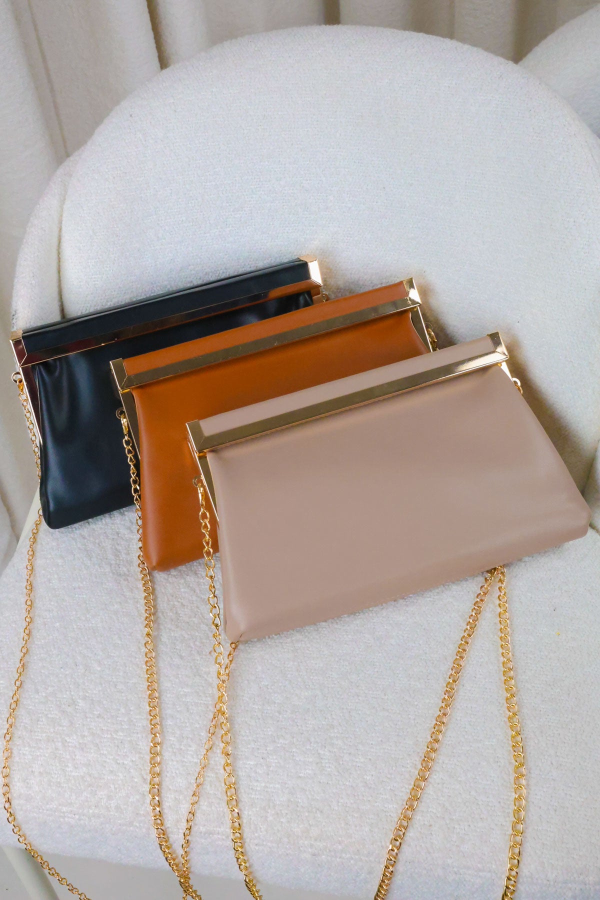 Make a refined statement with this classic black evening clutch, an essential accessory for any sophisticated wardrobe. Crafted from smooth, high-quality faux leather, this bag boasts a clean, structured design enhanced by elegant gold-tone metal bars at the top, which also frame the secure snap closure. Its compact yet functional interior is perfect for organizing your evening necessities like your phone, lipstick, and small wallet. This versatile clutch includes a delicate gold-tone chain strap, giving you the option to wear it hands-free as a shoulder bag or crossbody, or to tuck the chain inside for a traditional clutch style. Ideal for galas, formal dinners, or adding a polished finish to any outfit, this black and gold clutch is a timeless piece.