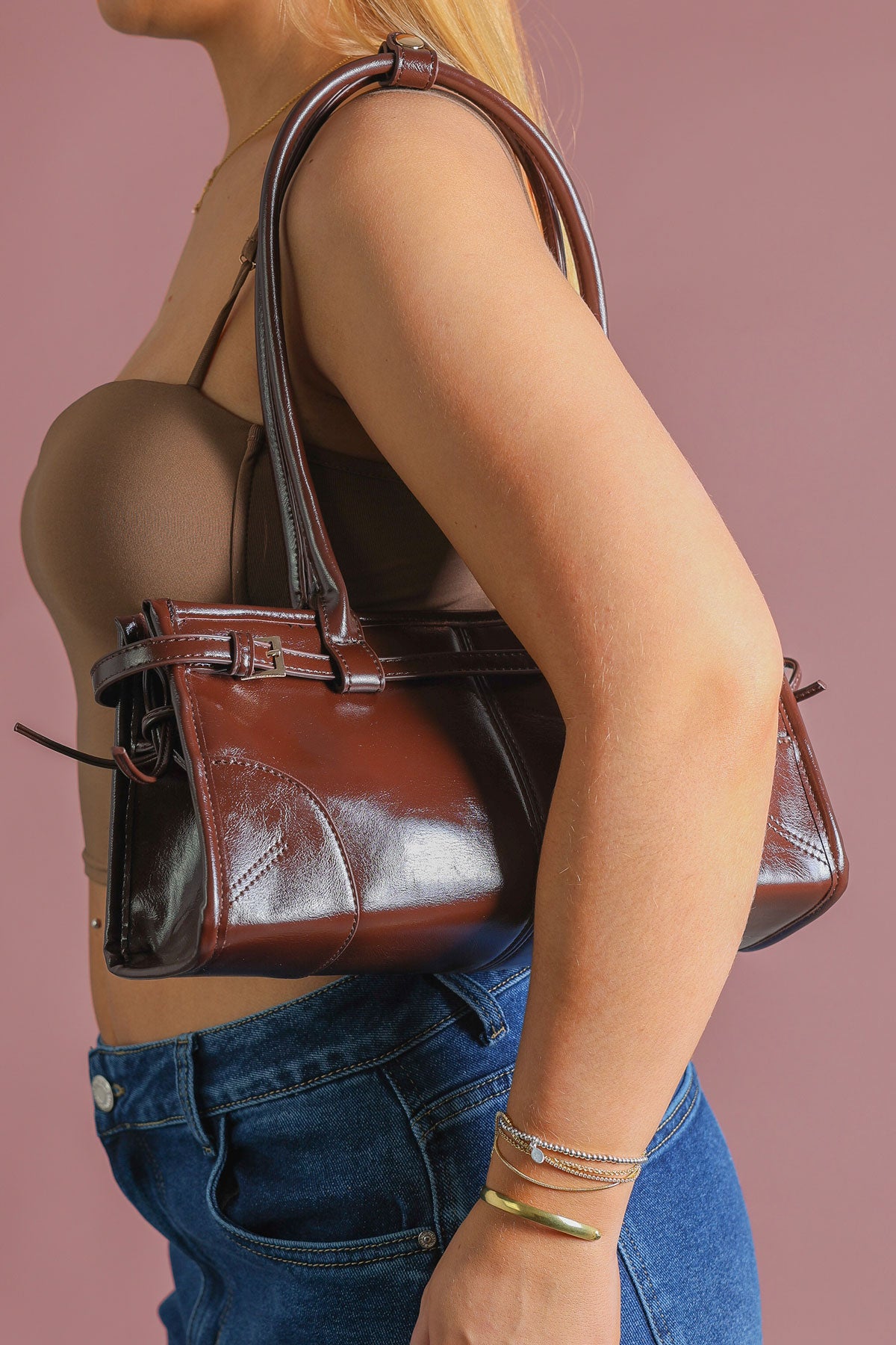 Channel timeless 90s style with this Brown Shoulder Bag. Featuring a high-shine, glossy faux leather-look finish, this rectangular baguette-style bag is detailed with chic side buckles and a double shoulder strap for a comfortable carry. The rich, dark brown tone and polished gold-tone hardware make it a versatile staple for any wardrobe.