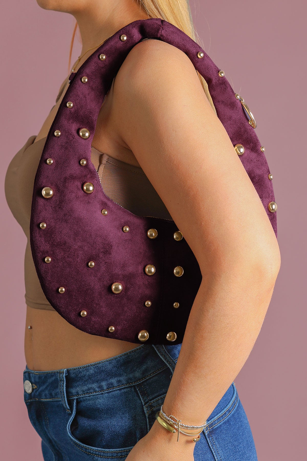Edgy Sophistication Meets Modern Design Make a bold statement with our Burgundy Studded Suede Crescent Bag. Crafted from ultra-soft faux-suede in a deep wine hue, this bag features a unique curved silhouette adorned with eye-catching gold-tone studs of varying sizes.
