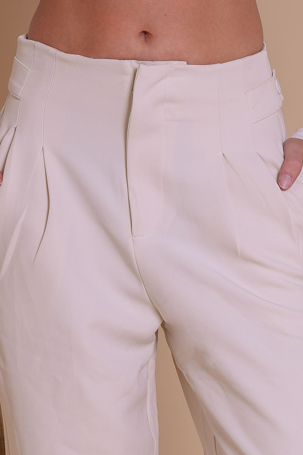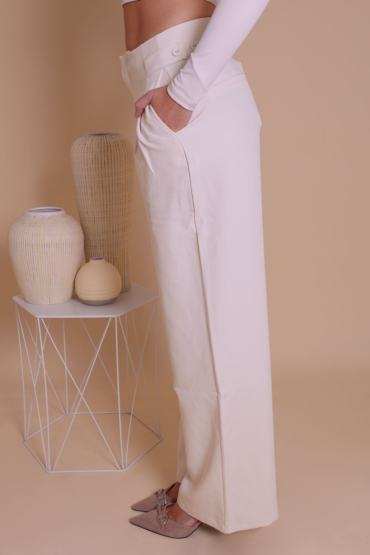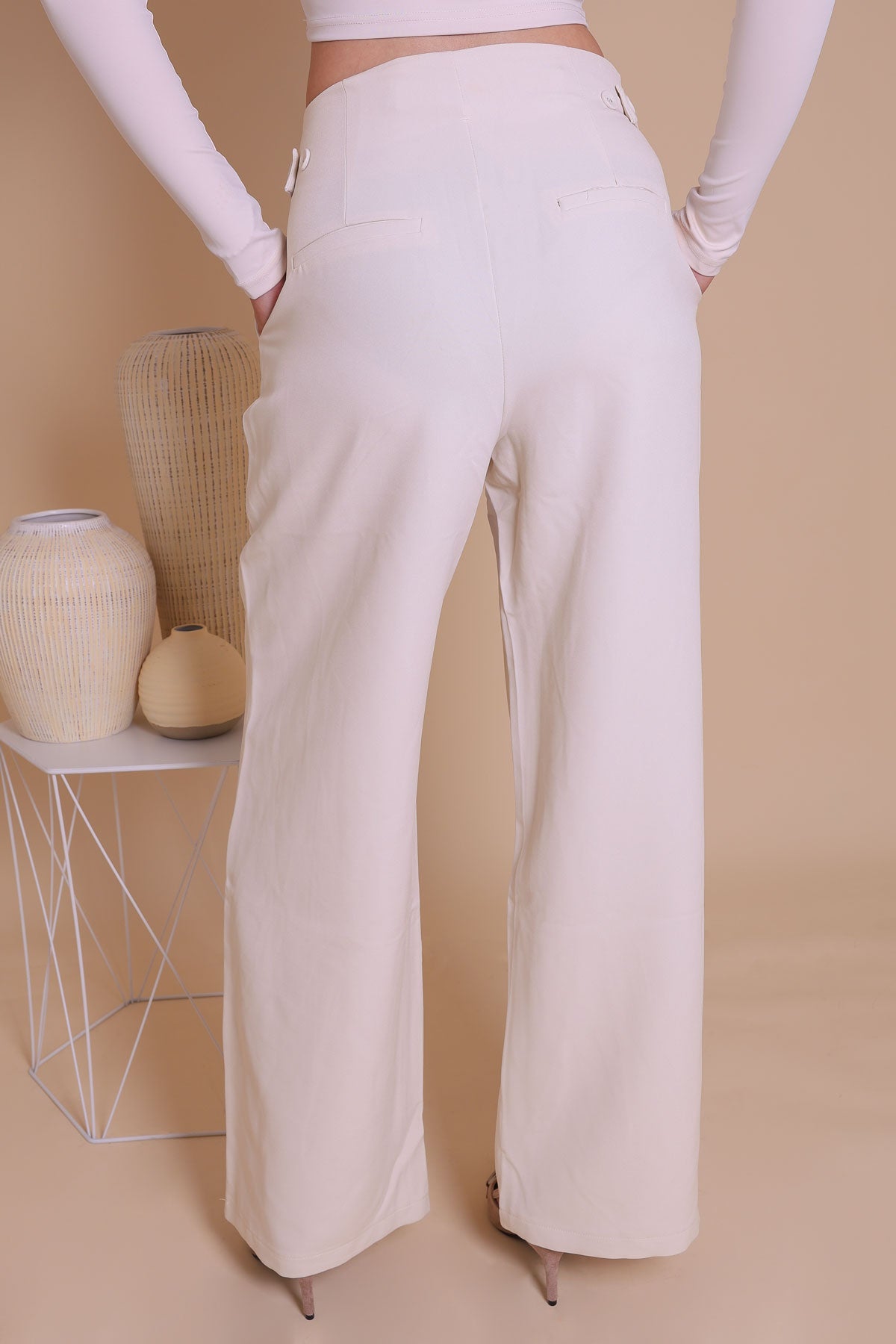 Exude effortless elegance with these high-waisted wide-leg trousers in a delicate light beige cream hue. Crafted from a smooth, flowing fabric, they offer a sophisticated drape and a comfortable fit. The high-waisted design and gentle pleating at the top create a flattering silhouette, while the wide-leg cut provides a modern, polished look. Perfect for both office wear and special occasions, these versatile trousers can be paired with a tailored blazer for a professional ensemble or a silk camisole for a chic evening outfit.