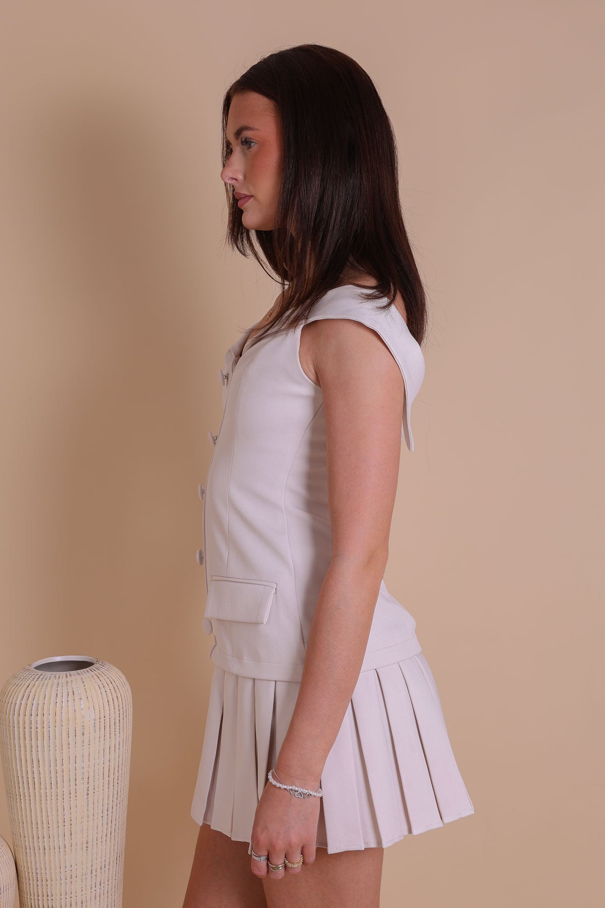 This unique mini dress combines a structured, tailored top with a playful pleated skirt. The top features an off-the-shoulder, shawl-style collar, a row of decorative buttons down the front, and two flap pockets on the waist. The bottom half is a short, fully pleated skirt. The dress is a light, neutral beige colour, making it a sophisticated and versatile piece for various occasions.