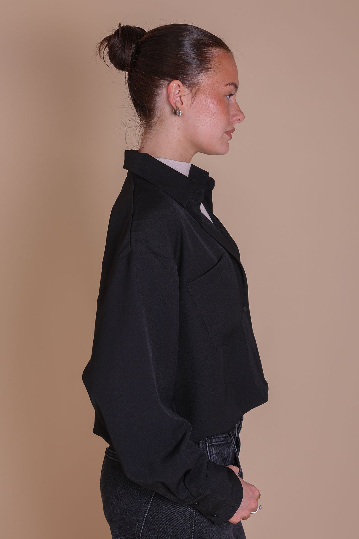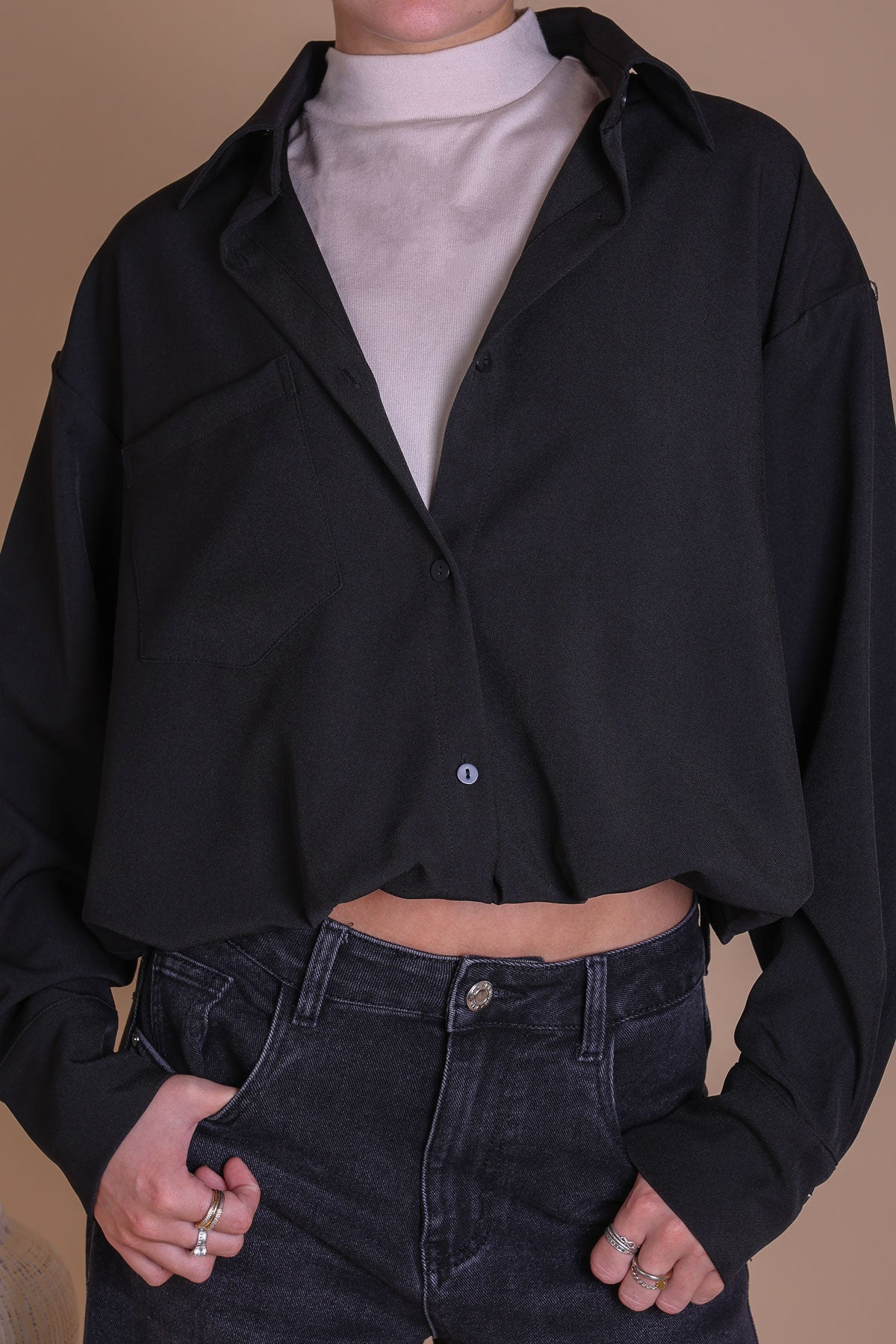 Get two looks in one with this simple and stylish set. The bubble hem, black-coloured button-up shirt features a collared neckline and full-length sleeves. It comes with attached beige mock neck top. This set is designed to be worn for effortless look, providing a complete and fashionable outfit.