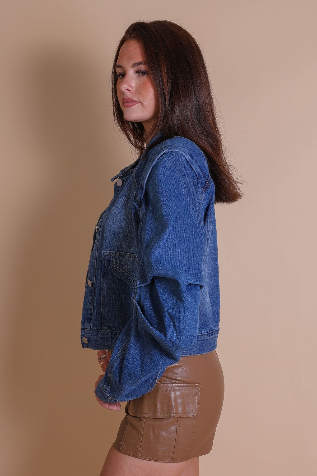 Step out in style with the our blue denim jacket, featuring a chic high collar and trendy barrel sleeves. This jacket, crafted from classic denim, adds a playful edge to your look while offering a flattering silhouette. Perfect for layering, it brings a fun twist to classic denim wear.