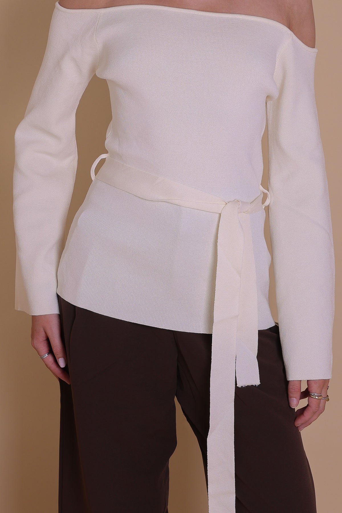 Elevate your everyday style with the Off-the-Shoulder Knit Top. This sophisticated and versatile piece features a flattering off-the-shoulder neckline and long, wide bell sleeves that create a dramatic and elegant silhouette. Crafted from a soft, high-quality knit fabric, it drapes beautifully and provides a comfortable fit. The top comes with a matching fabric belt that cinches the waist, allowing you to customize the fit and add a touch of definition. Perfect for a chic night out or a stylish daytime look, this top is a must-have addition to your wardrobe.