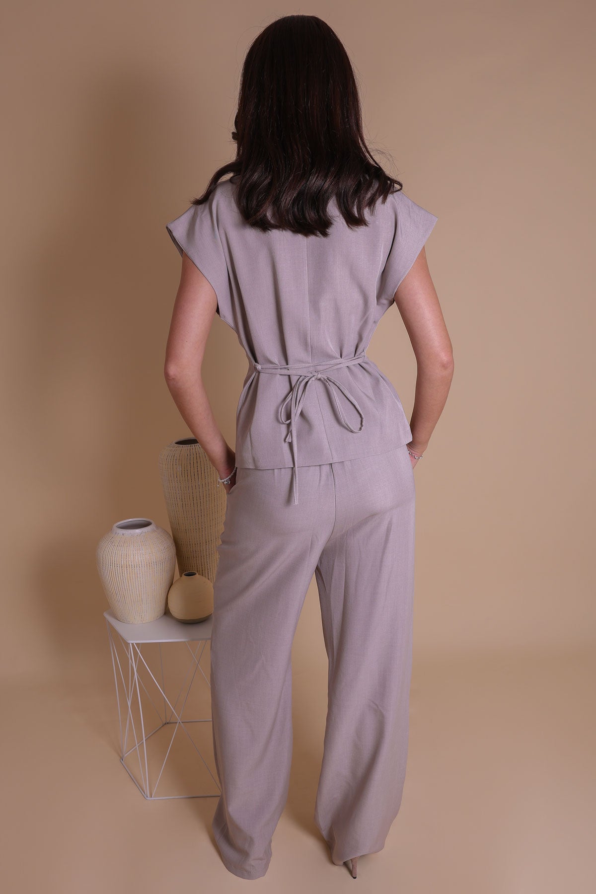 Achieve a polished and modern look with this chic two-piece set. The ensemble features a sleeveless waistcoat-style top in a versatile taupe which cinches at the waist with a coordinating belt and is accented with decorative buttons. The matching wide-leg trousers have a high-waisted fit and a relaxed, flowing silhouette, creating an elegant and comfortable feel. This set is perfect for both professional settings and casual outings, offering a sophisticated and put-together outfit with minimal effort.