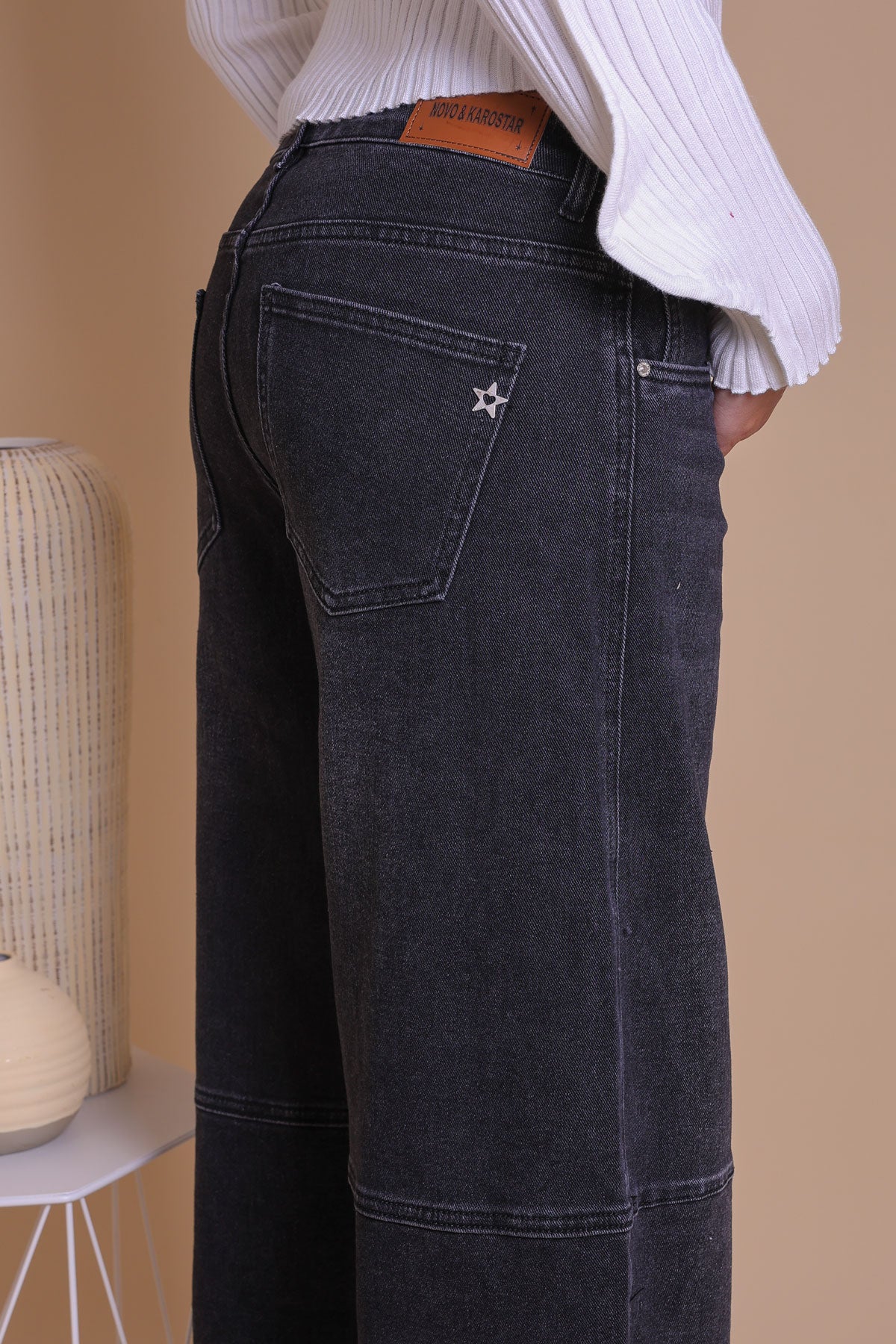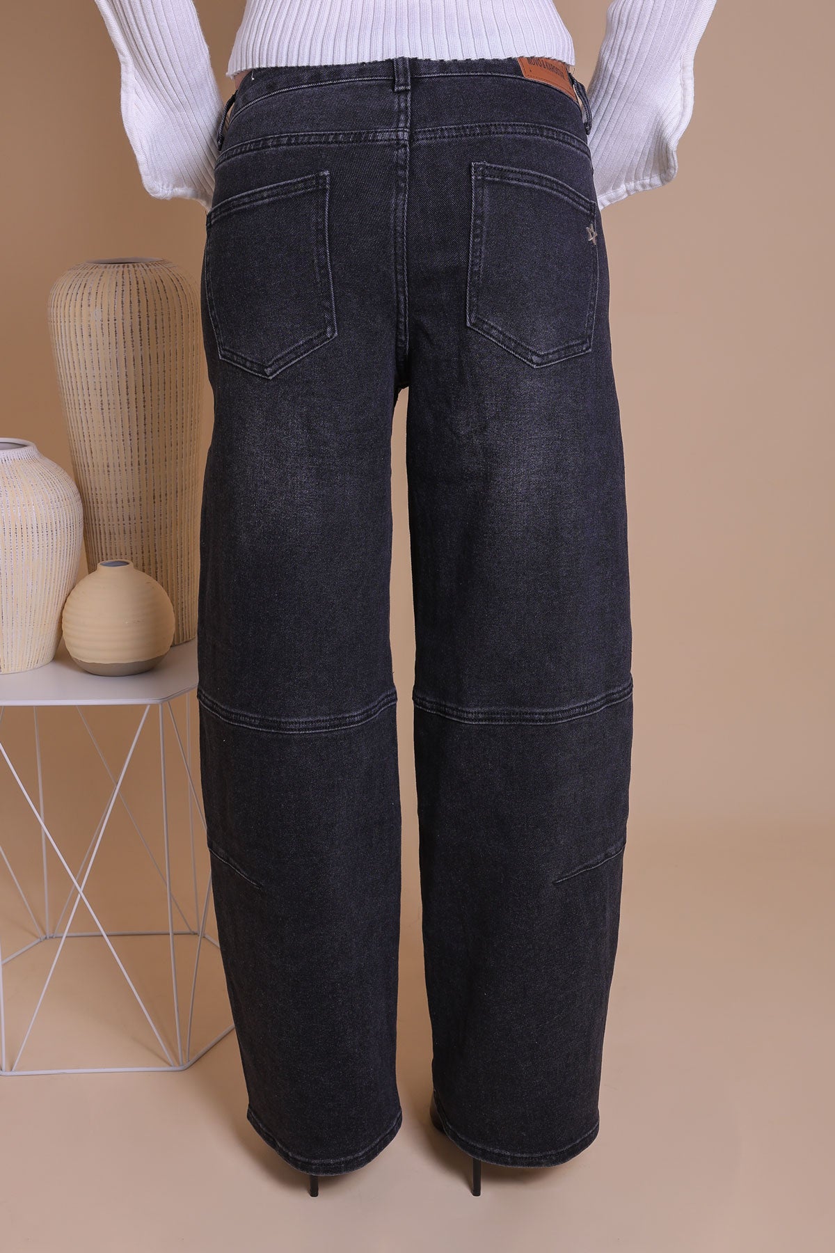 Elevate your denim collection with these Black wash barrel-leg jeans, featuring a clean and modern design. Crafted from classic black denim, these jeans offer a timeless look with a contemporary twist. The defining feature is the subtle paneling on the knees and mid-thigh, which adds a structured and unique visual element without being overly bulky. The high-waisted fit and relaxed barrel-leg silhouette provide both comfort and a flattering, elongated look. These versatile jeans are perfect for dressing up with a blouse and heels or keeping it casual with a simple t-shirt and sneakers.