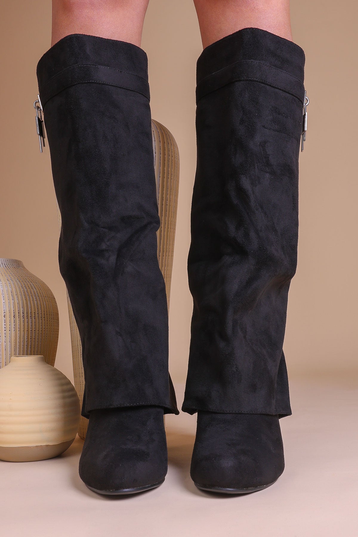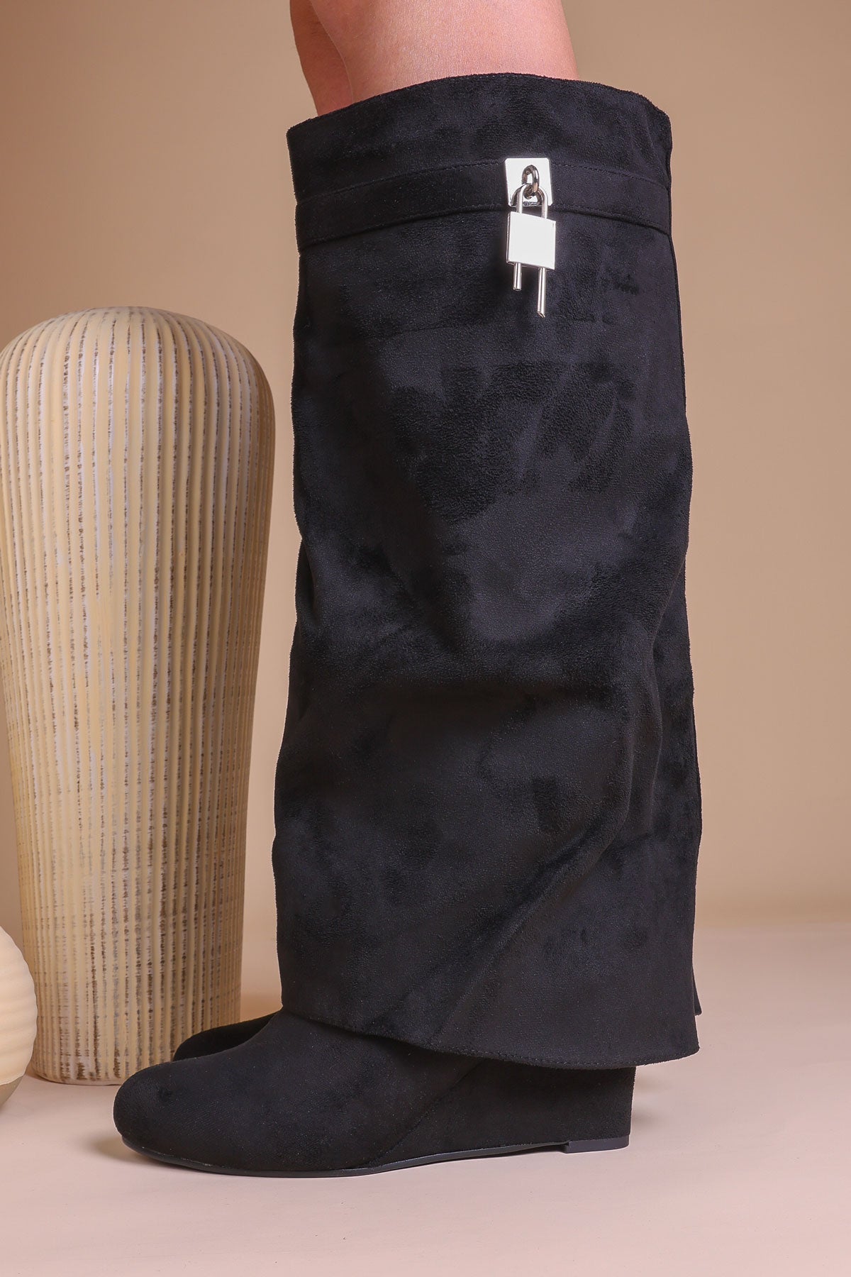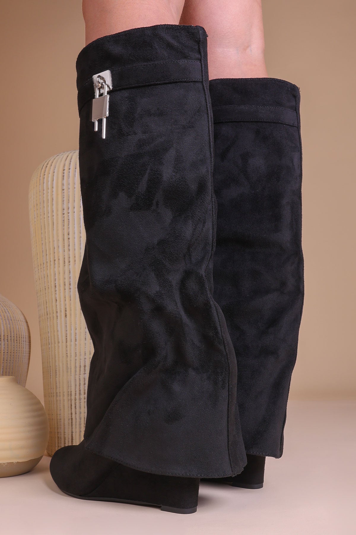 Step up your style with these chic black faux suede fold over wedge knee-high boots. Designed with a sleek silhouette, soft faux suede finish, and a comfortable wedge heel, these boots offer both elegance and all-day wearability. The subtle silver side buckle detail adds a modern touch, making them perfect for pairing with dresses, skirts, or skinny jeans. Ideal for autumn and winter fashion, these boots bring a versatile edge to your wardrobe.