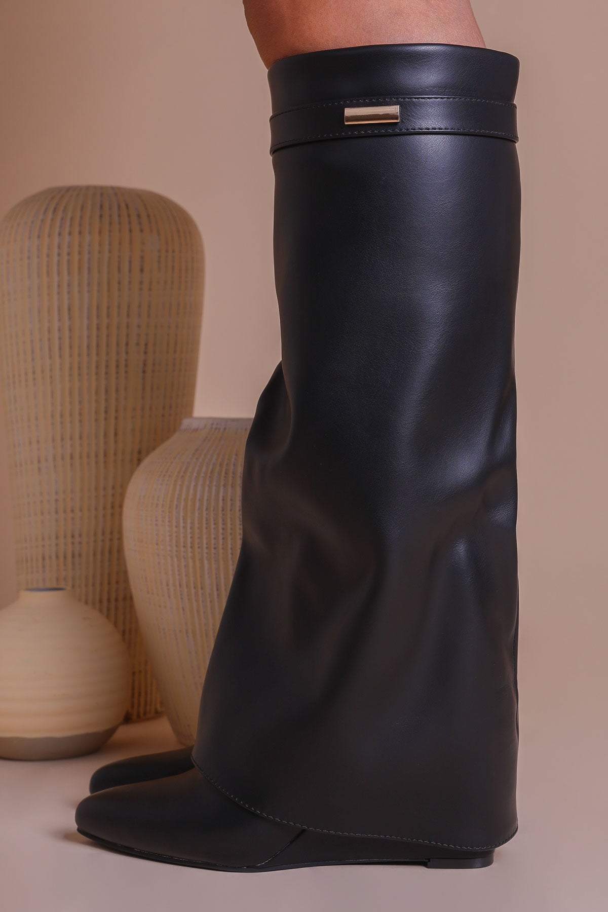 Introducing the ultimate night-out boot. A glamorous play on the cowboy boot trend. Featuring a luxury faux leather material, just below knee high height and a wedge heel for maximum comfort- we are obsessed.