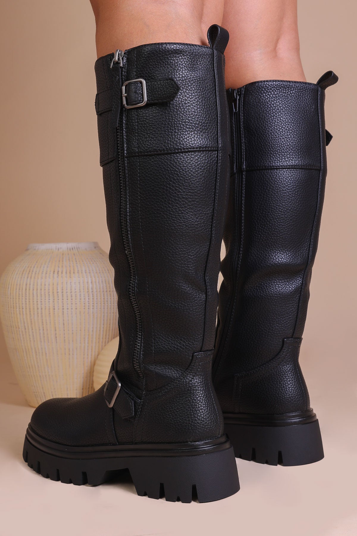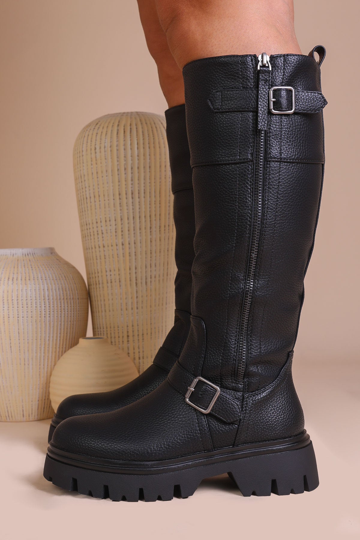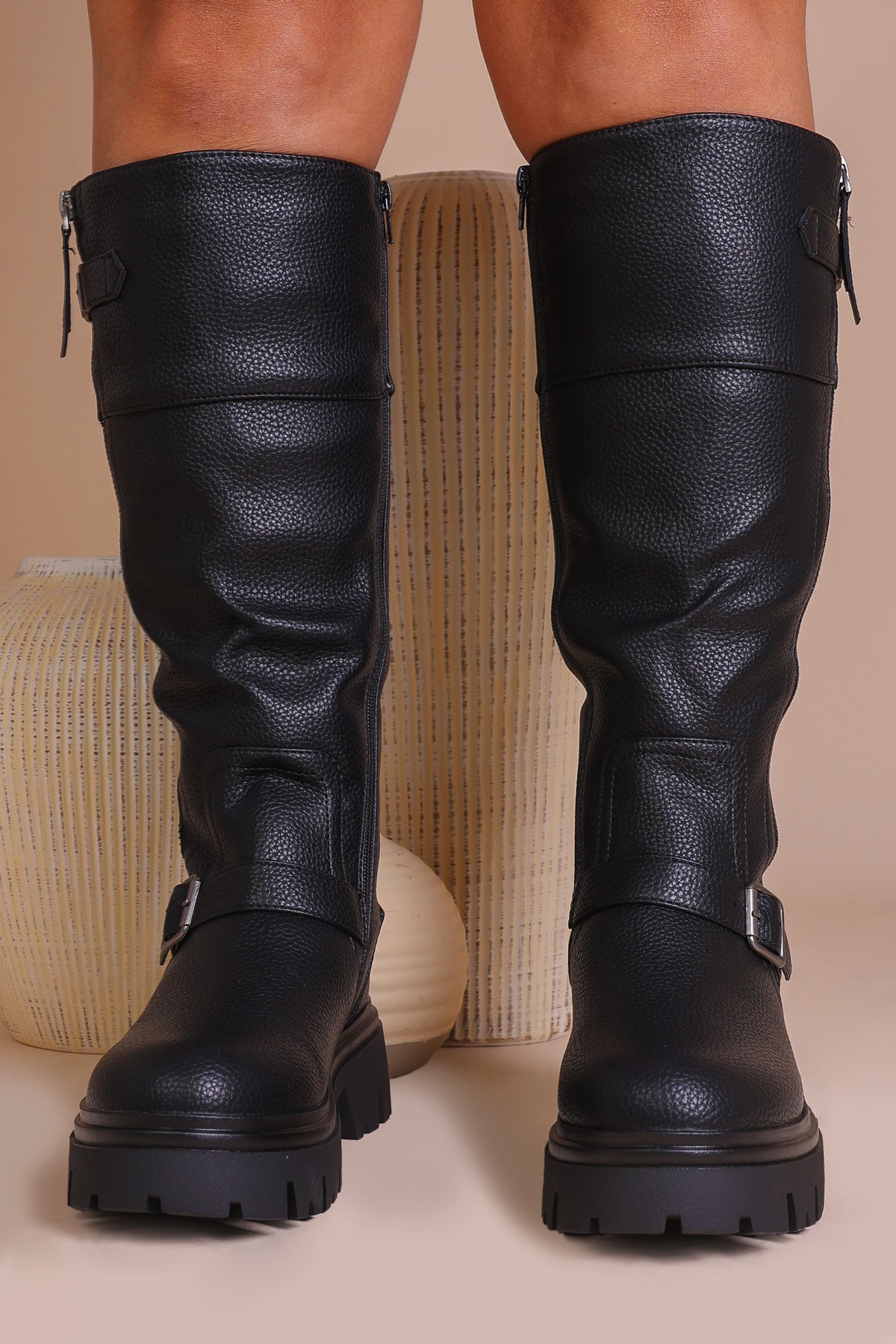 Black Faux Leather Chunky Lug Sole Zip Detail Knee-High Biker Boots