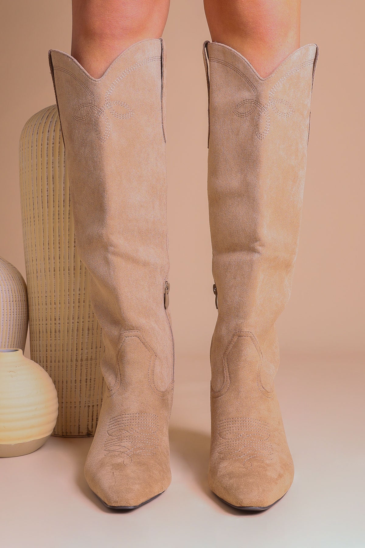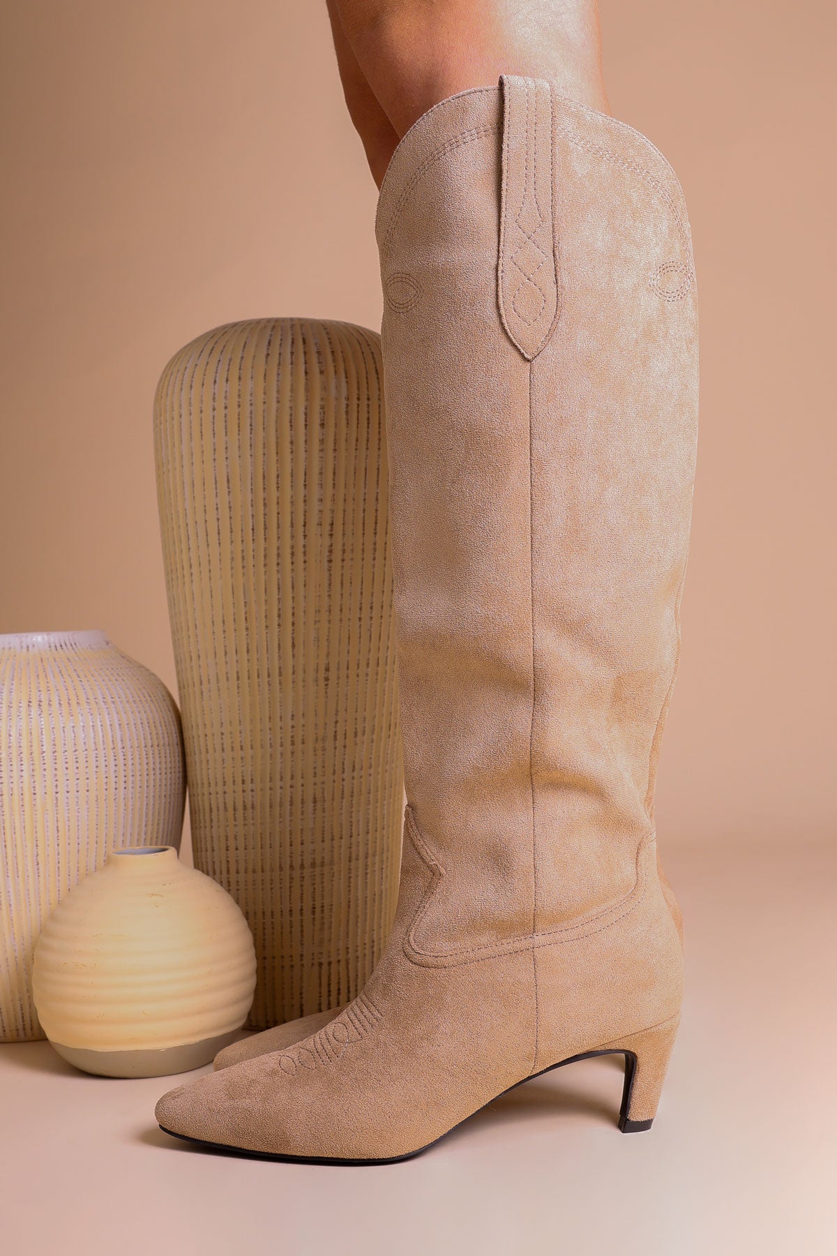 Step up your style with these chic faux suede knee-high boots. Blending classic western flair with a modern silhouette, these boots feature intricate stitching along the vamp and shaft. The elegant pointed toe and subtle kitten heel add a touch of sophistication, making them perfect for both casual and dressy occasions. Crafted from soft, luxurious faux suede, they feel as good as they look. Pair them with your favorite denim, a flowy dress, or a skirt for a versatile and fashionable look all season long.