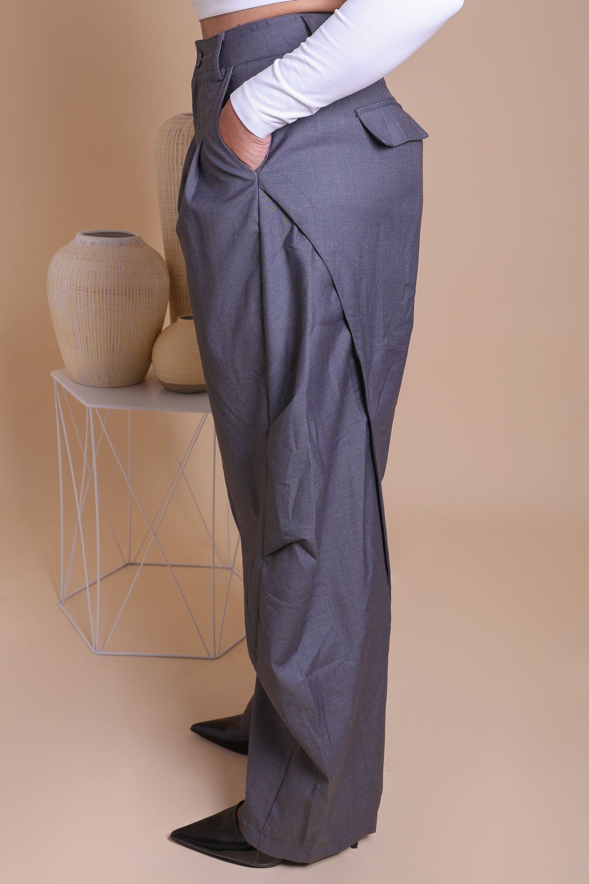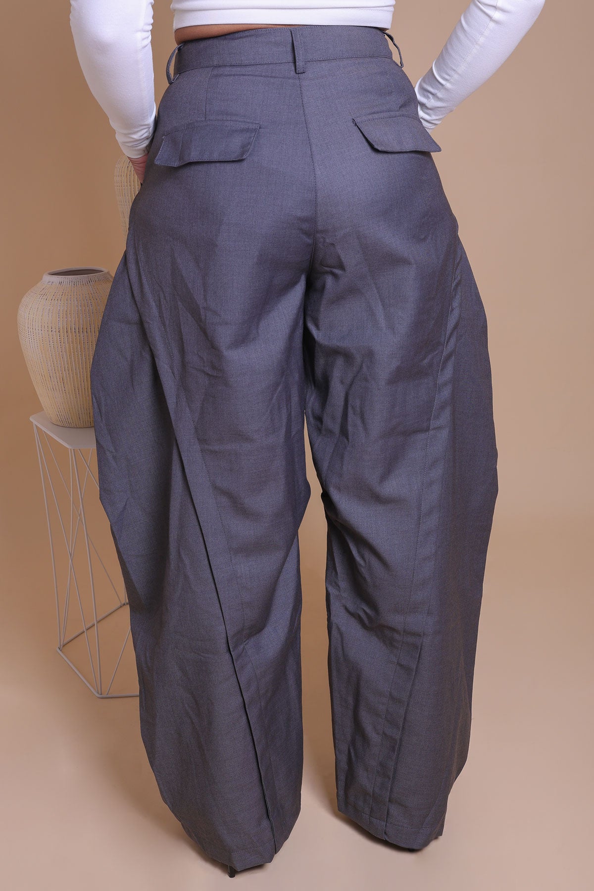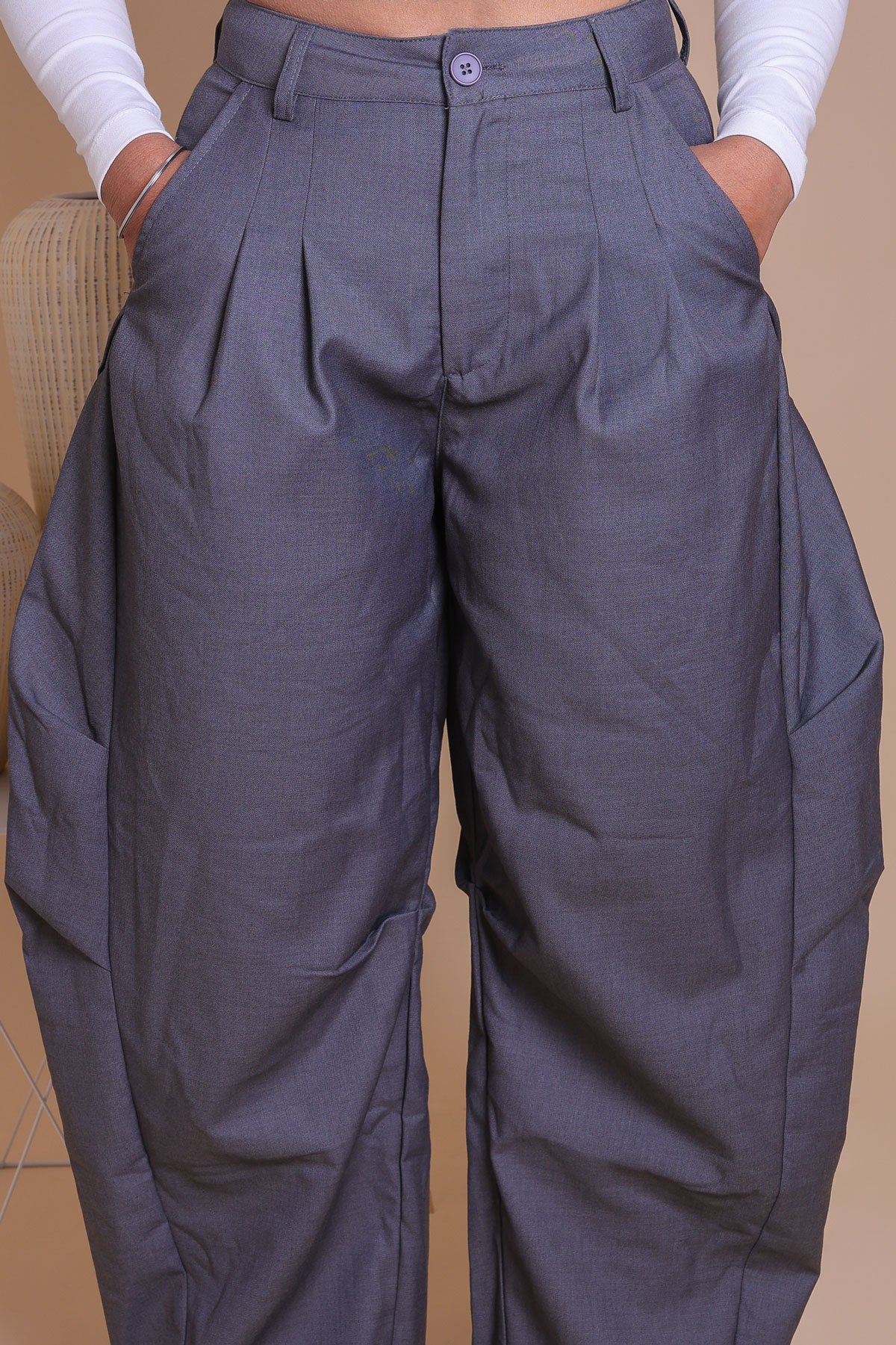 Make a bold statement with these grey barrel-leg trousers, designed for a modern and edgy silhouette. Crafted from a comfortable cotton-polyester blend, these pants feature a high-waisted fit and a unique paneled construction that creates a distinct, curved shape. The pleated front adds a touch of tailored sophistication, while the side cargo-style pockets are practical blending use ability with high fashion. The relaxed fit through the thigh and the tapered ankle give these trousers their signature barrel-leg look, perfect for a fashion-forward casual or smart-casual outfit.