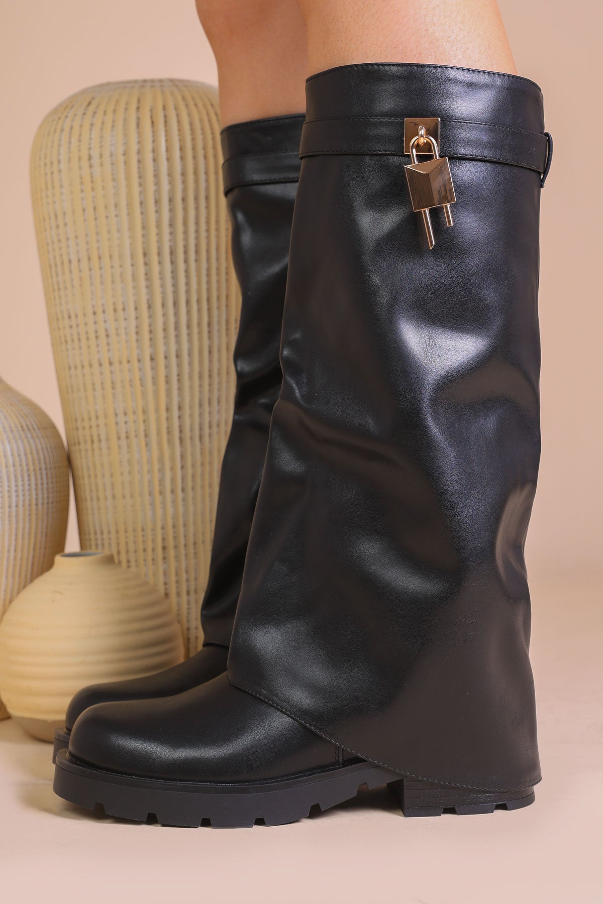 Black Fold Over Shark Knee-High Lock Buckle Boots