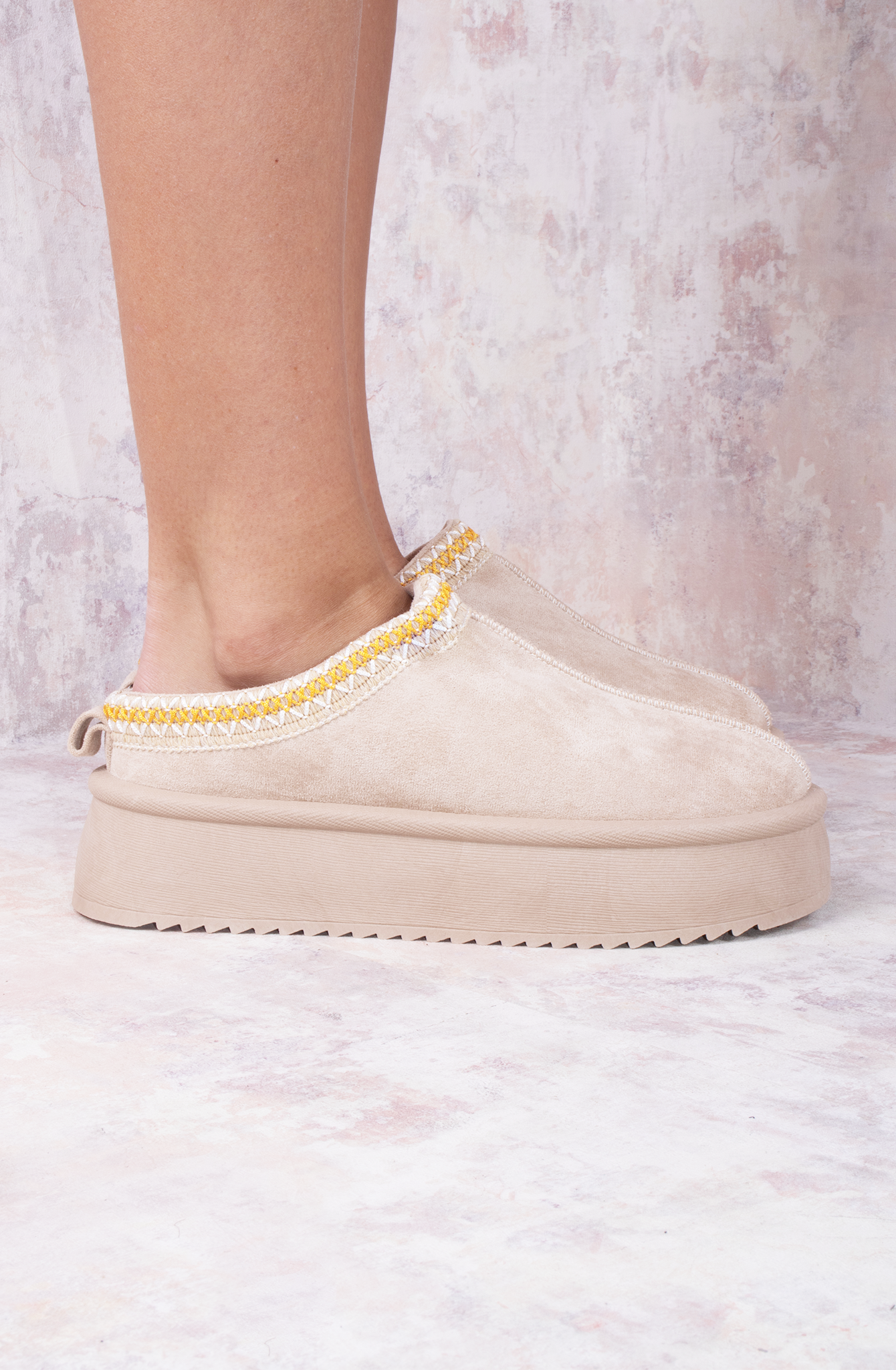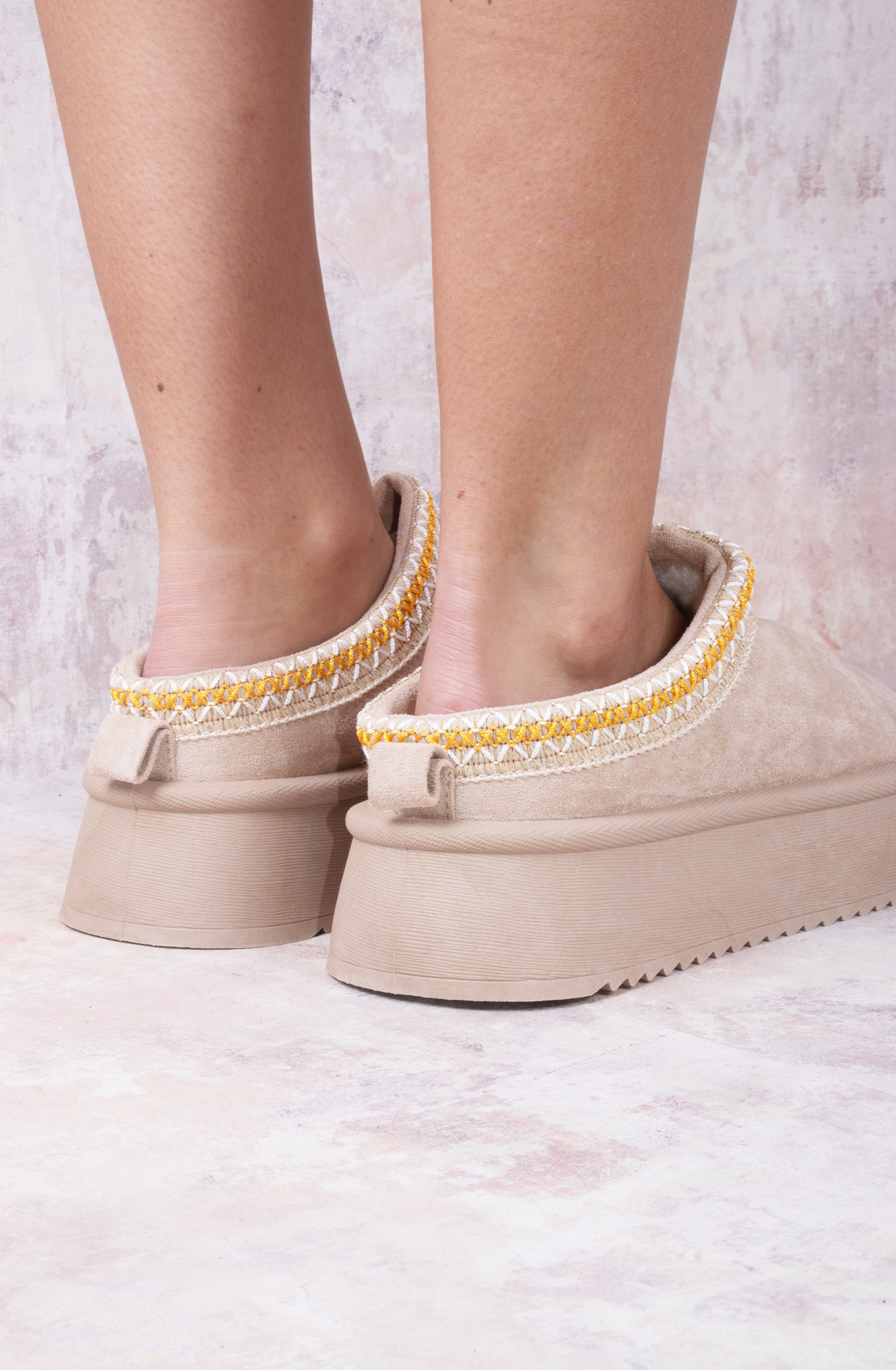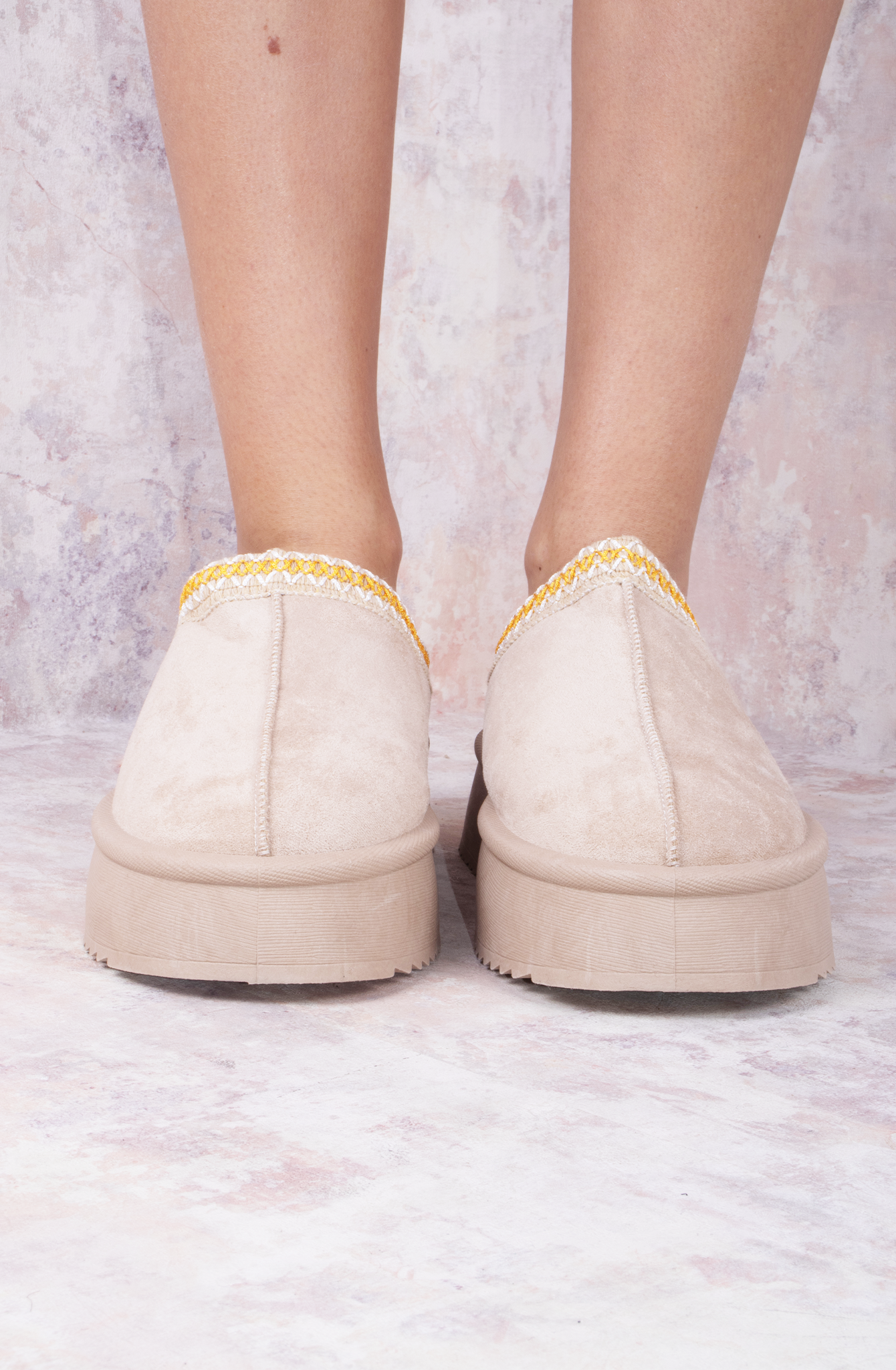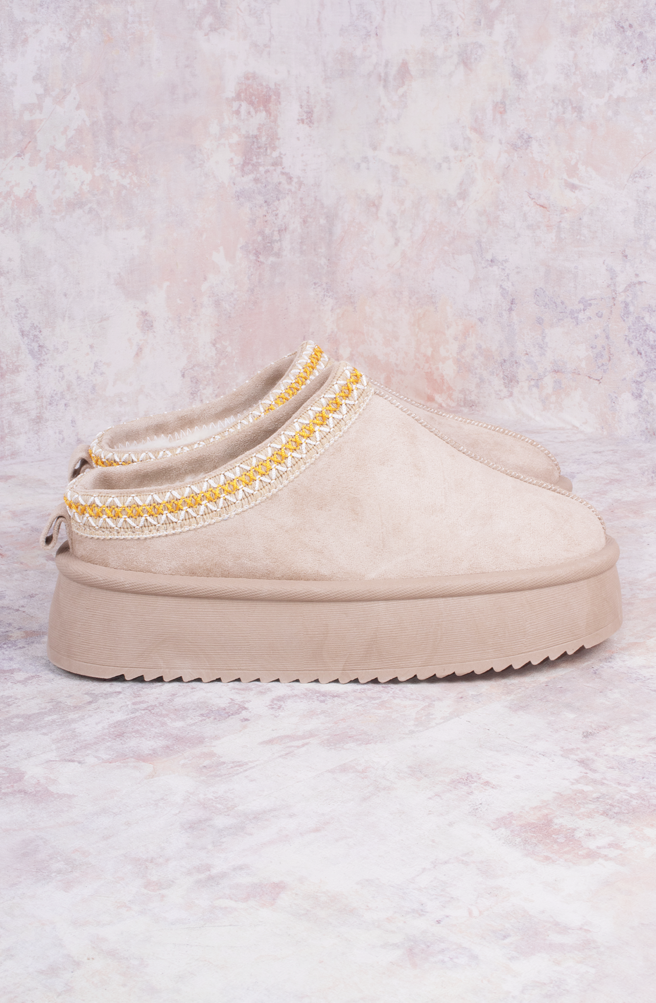 Girl, get that insta-worthy look with these must haves. Featuring a flattering platform sole in a faux suede material, with aztec detailing, faux fur lining and a slipper design. Pair with any outfit to upgrade your look.