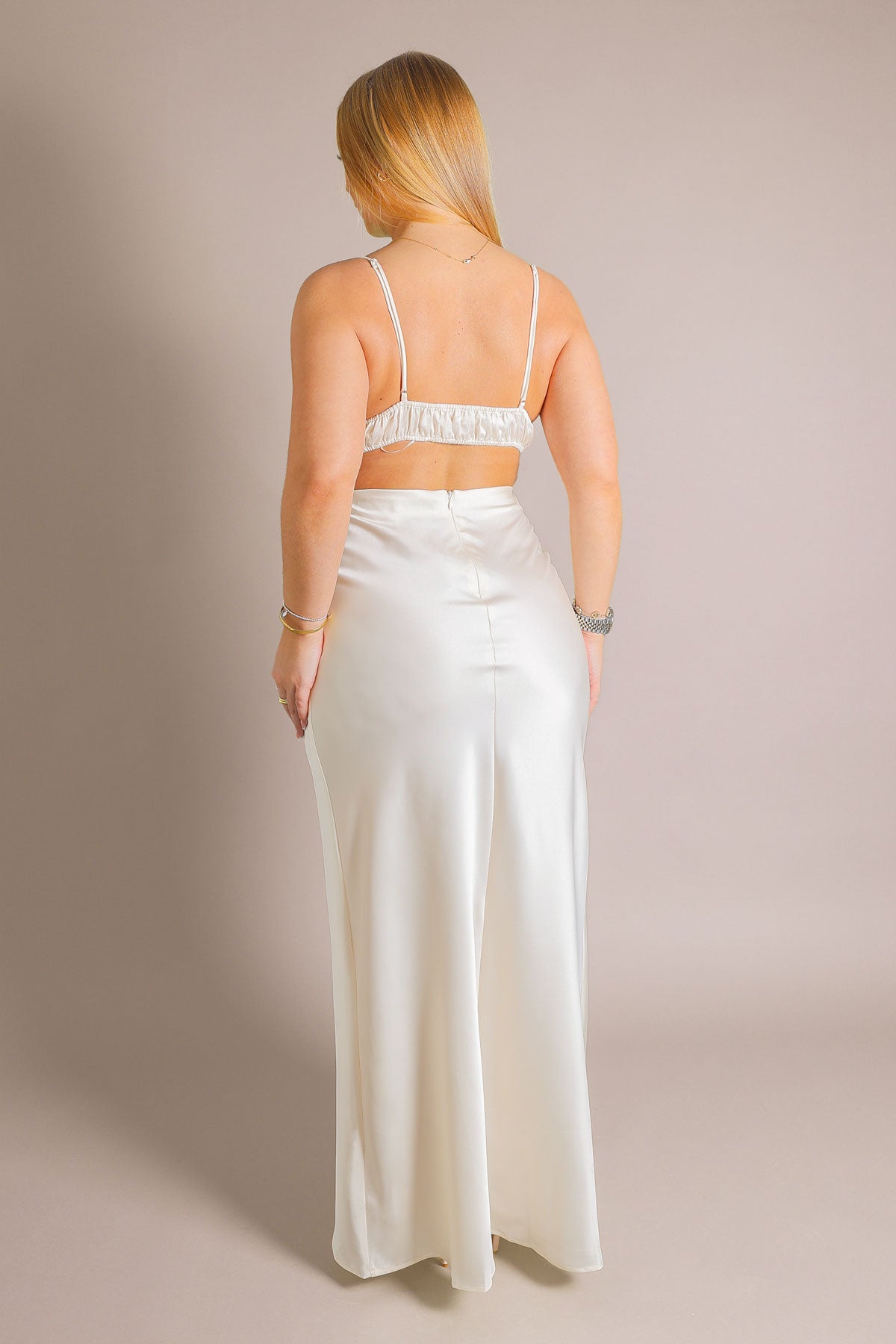 Elevate your event wardrobe with our Cream Satin V-Neck Maxi Dress. This stunning floor-length piece is designed to create a sleek, elongated silhouette. Featuring a deep V-neckline that adds a touch of sophistication and a bias-cut skirt that flows gracefully as you move, it’s the perfect blend of modern minimalism and timeless elegance.