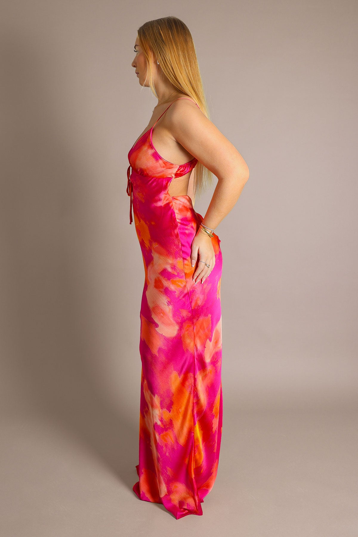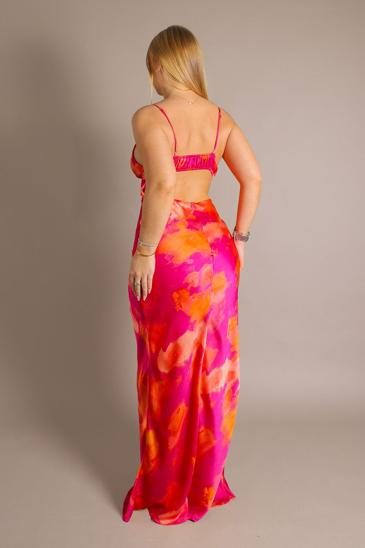Get occasion ready with this fuchsia satin open back maxi dress. Brought to you in a deep in deep fuchsia multi hue satin material with an open back design and a maxi length. Back zip fastening and front tie for that extra detail. how can you resist?