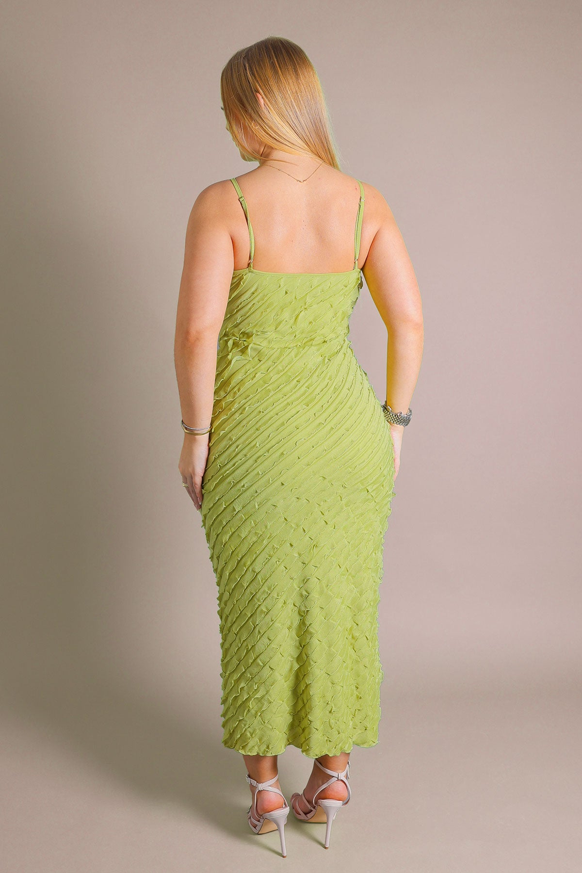 Stand out this season in our Green Ruffle Maxi Dress. This statement piece is defined by its unique diagonal ruffle texture that adds incredible movement and dimension to your look. With a flattering V-neckline and slim spaghetti straps, this dress is designed for the woman who isn't afraid to be the centre of attention.