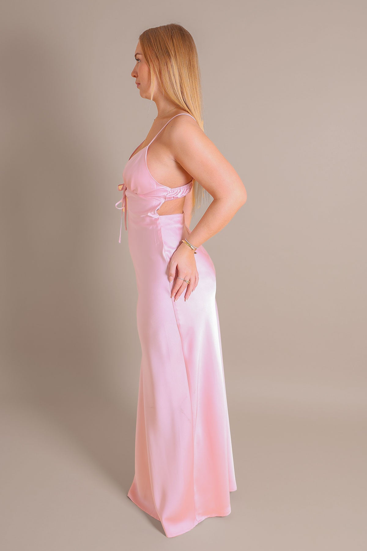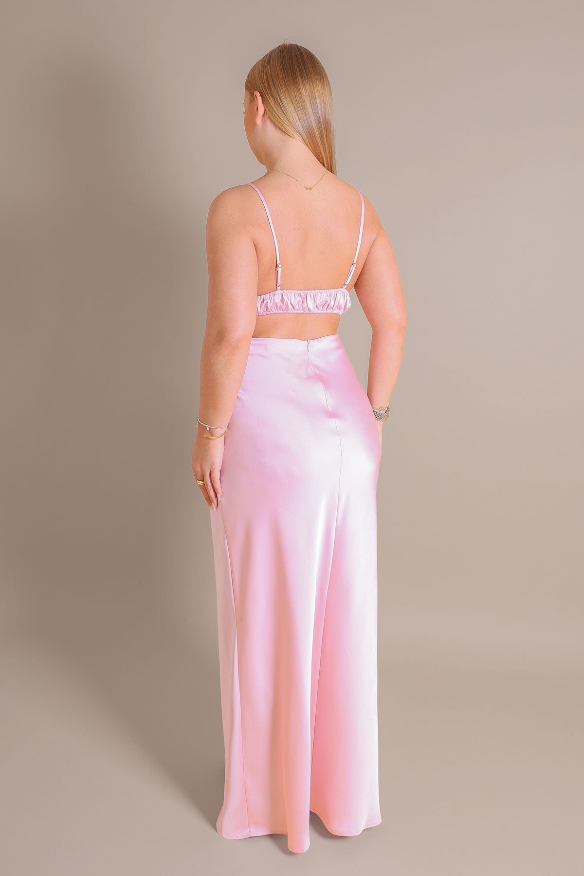 Elevate your event wardrobe with our Pink Satin V-Neck Maxi Dress. This stunning floor-length piece is designed to create a sleek, elongated silhouette. Featuring a deep V-neckline that adds a touch of sophistication and a bias-cut skirt that flows gracefully as you move, it’s the perfect blend of modern minimalism and timeless elegance.