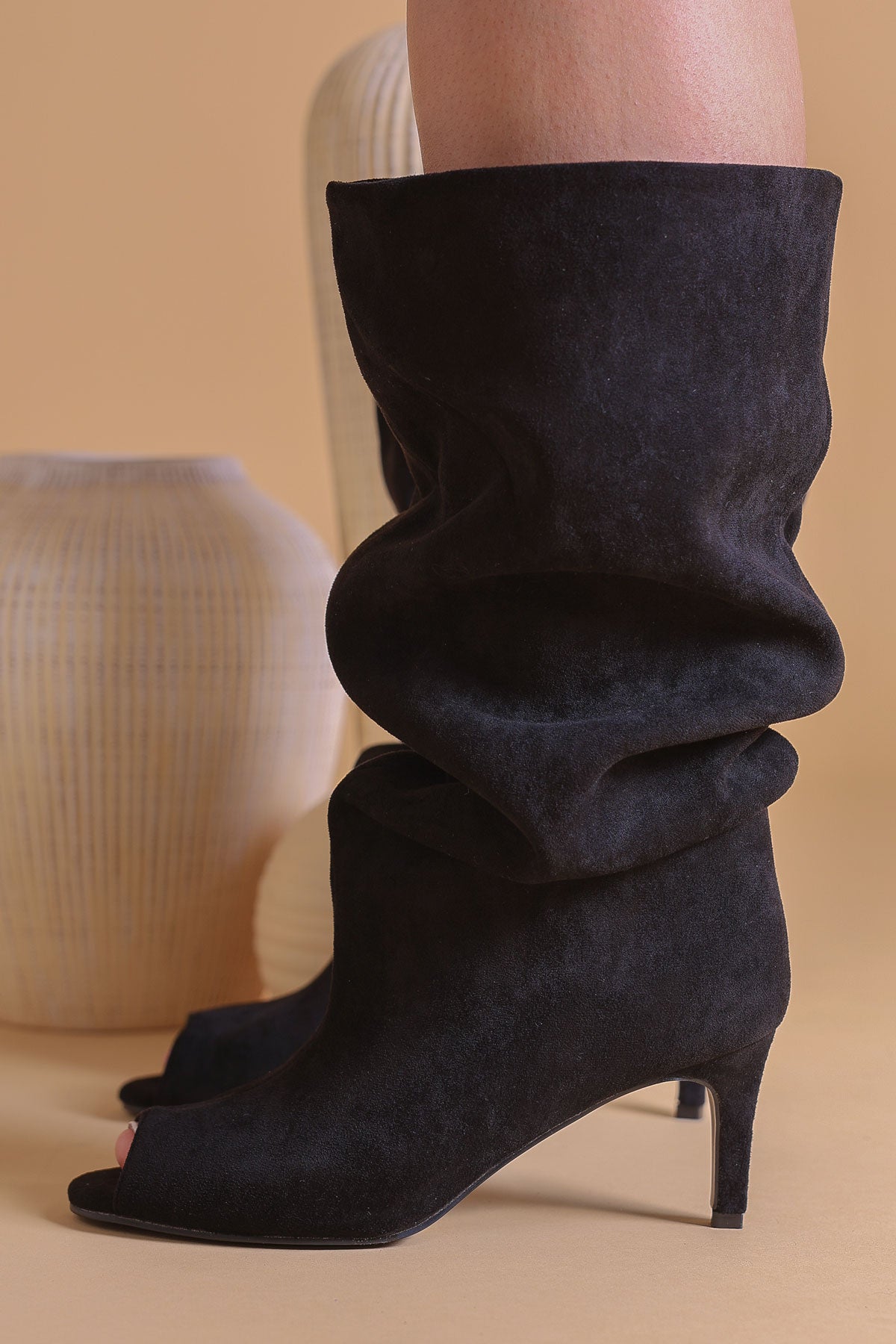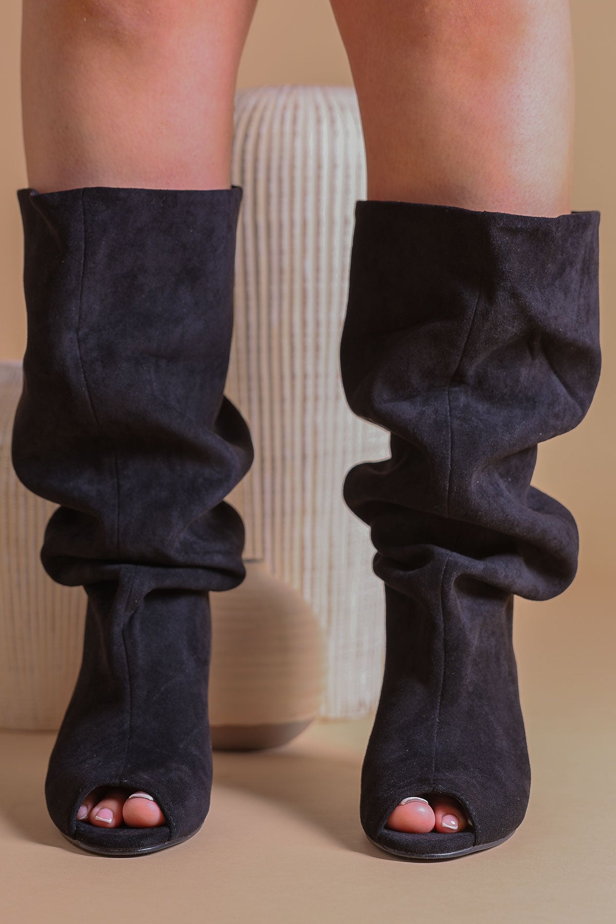 Black Peep-Toe Suede Kitten Heel Slouched Boots