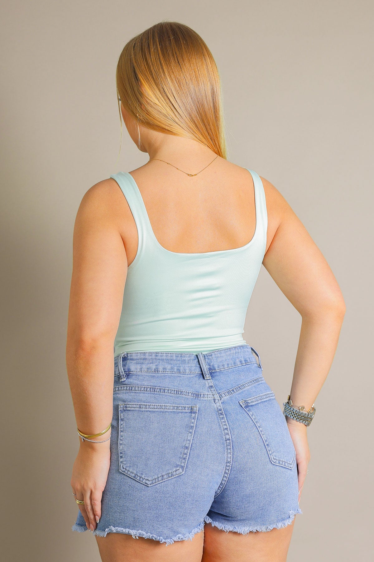 Streamline your style with our Square Neck Bodysuit. In a soft, mint green hue, this form-fitting piece features a modern square neckline and thick straps for a clean, sophisticated look.