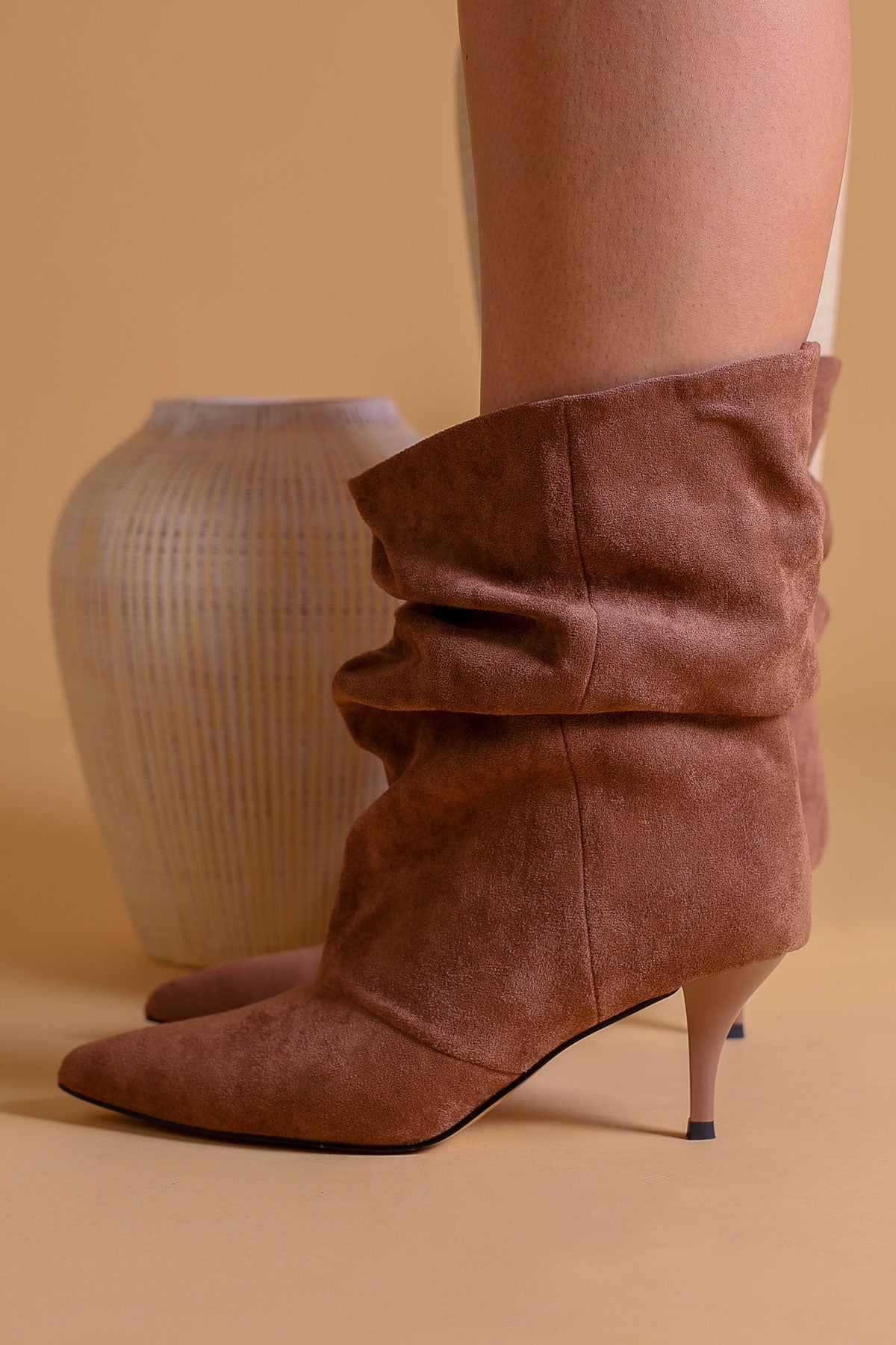 Tan Ruched Slouch Mid-Heel Ankle Boots