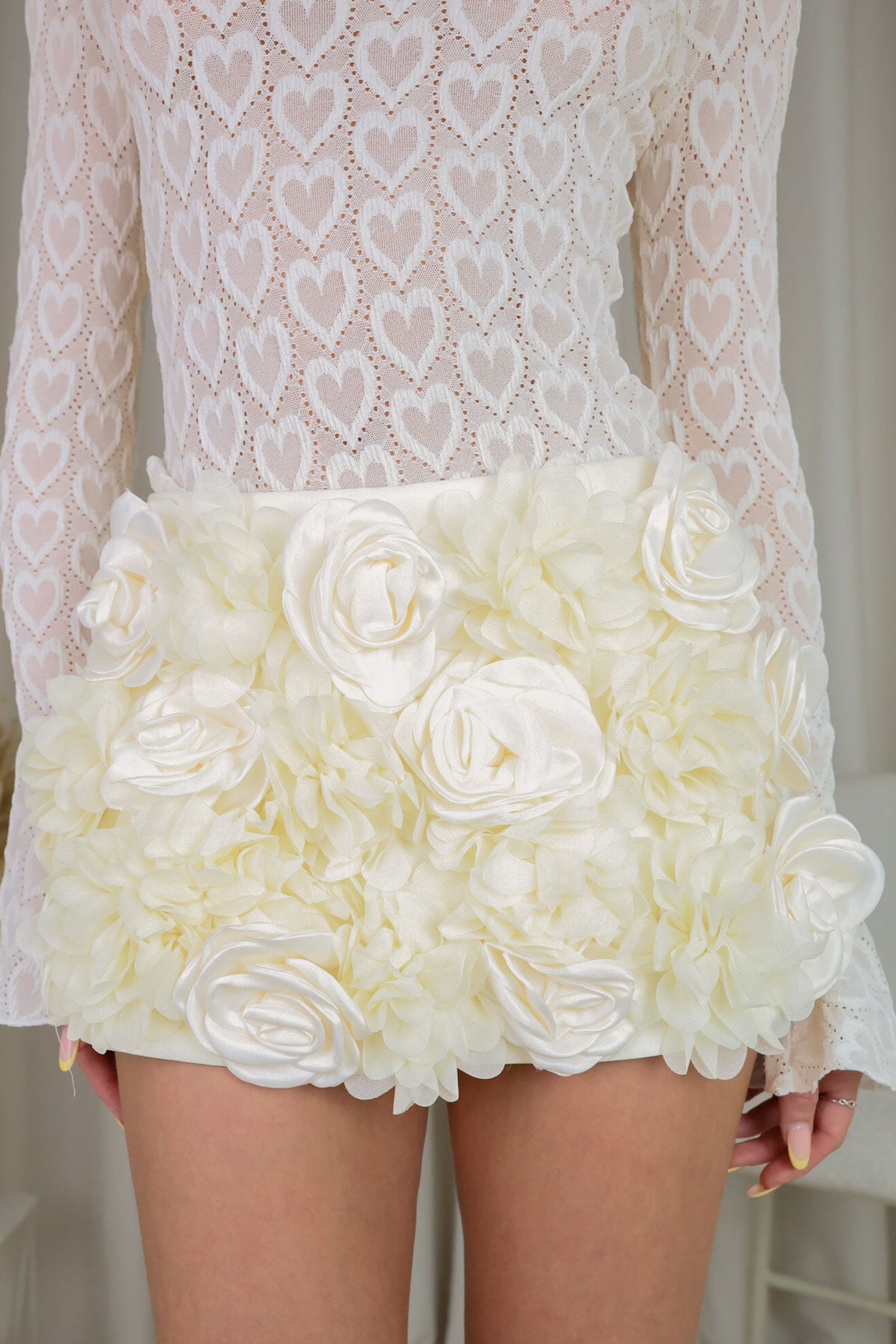 This is a stylish pink floral mini skort with a statement 3D rosette design. The skort is adorned with textured fabric flowers, giving it a bold, feminine, and ultra-glamorous look. It offers a flattering silhouette, and features a concealed zip closure for a seamless fit. The combination of structured shorts with a skirt overlay provides both elegance and comfort.