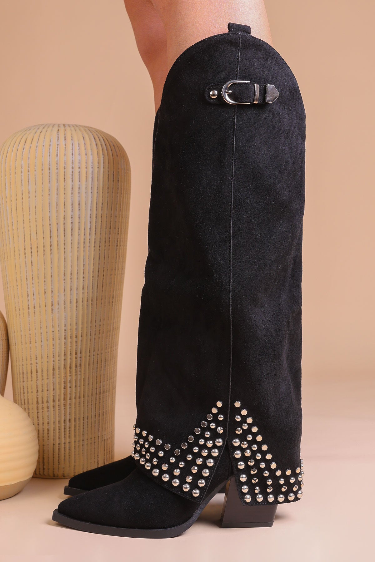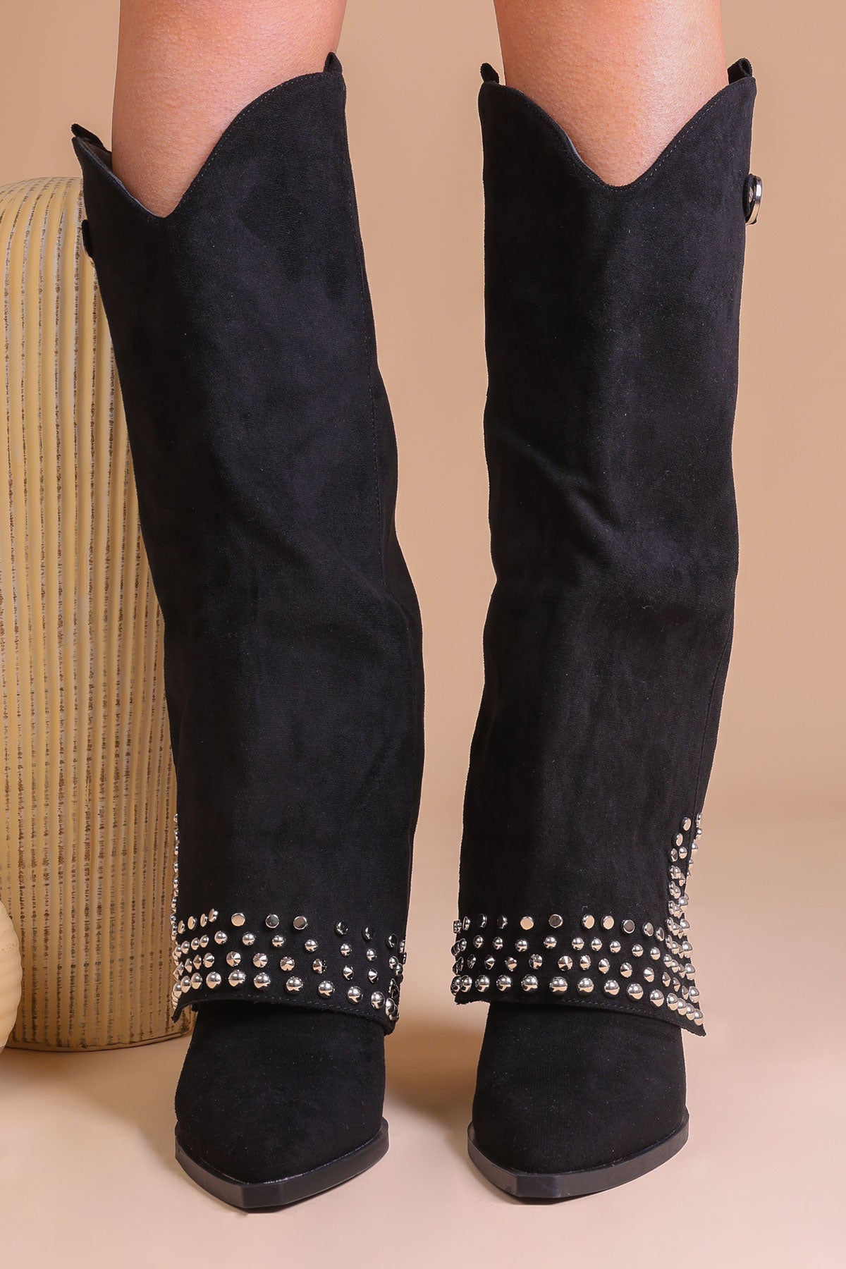 Our new Black Faux Suede, Knee-High, Studded Shark Boots are going to be your new favourite night-out shoe. Perfect for drinks with girls or that festival you've got booked. This is the perfect accessory to finish the look with our buckle detailing and sparkling studs, you're guaranteed to catch a few eyes! Whether you pair them with a mini dress or frilly skirt these boots have got you covered.