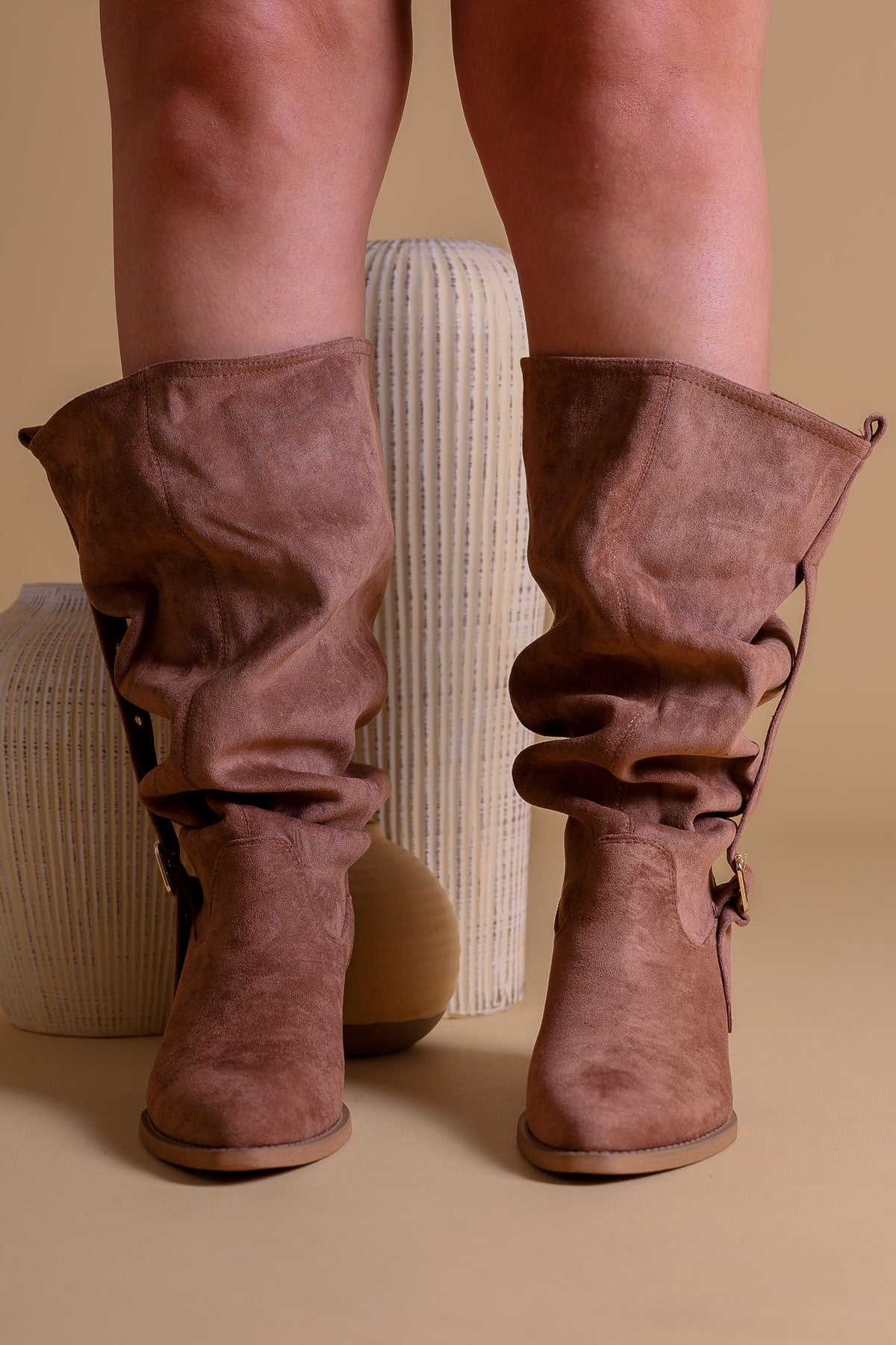 Tan Slouched Cowboy Boots with Buckle Detail