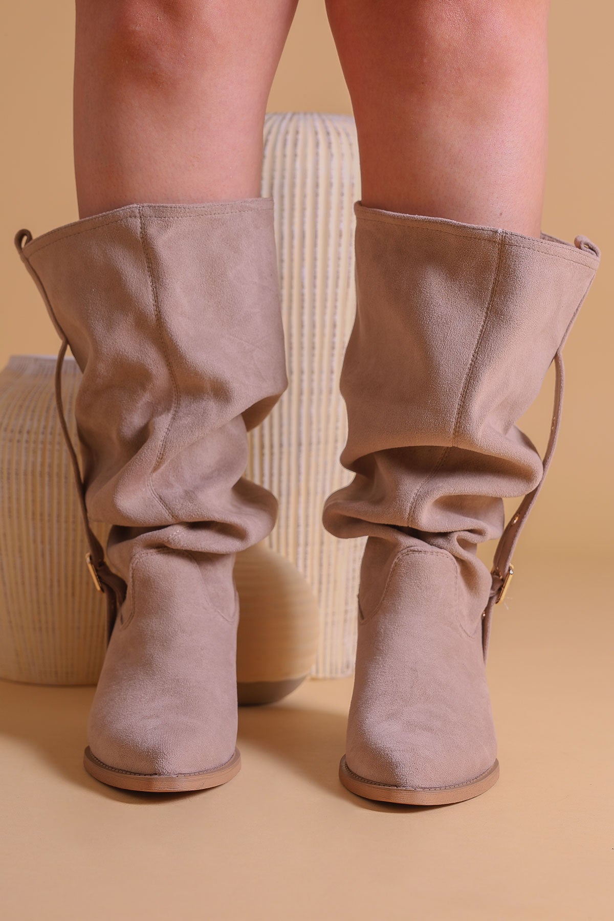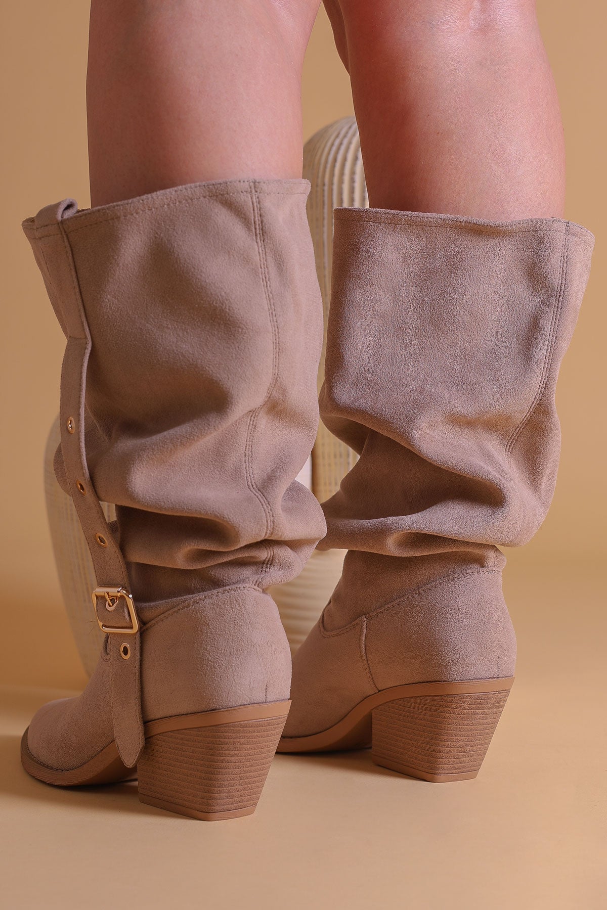 Taupe Slouched Cowboy Boots with Buckle Detail