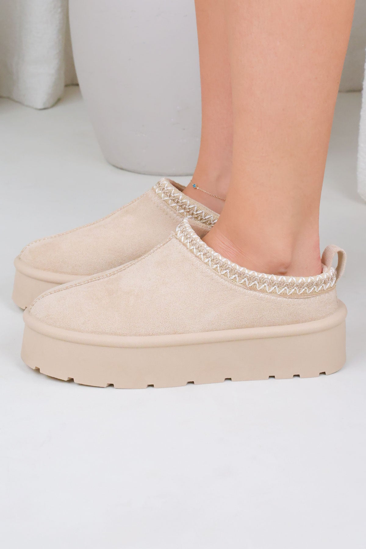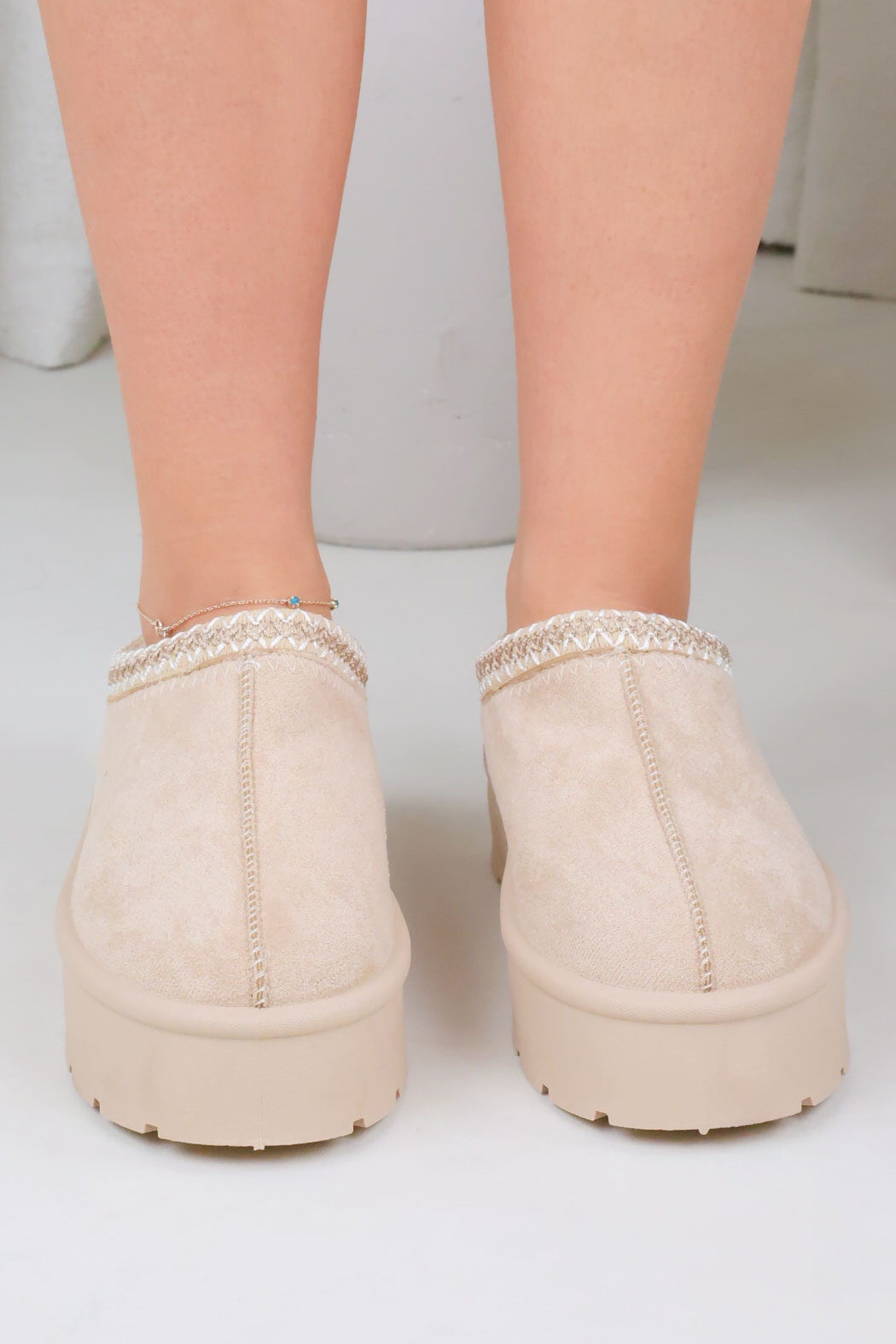 Step into ultimate comfort and style with our Beige Faux Suede Platform Mules. Crafted from a soft, suede-like material, these slip-on shoes feature a trendy chunky platform sole for added height and a unique Aztec-inspired stitch trim around the opening. Perfect for casual wear, indoor lounging, or adding an edgy touch to your everyday look.