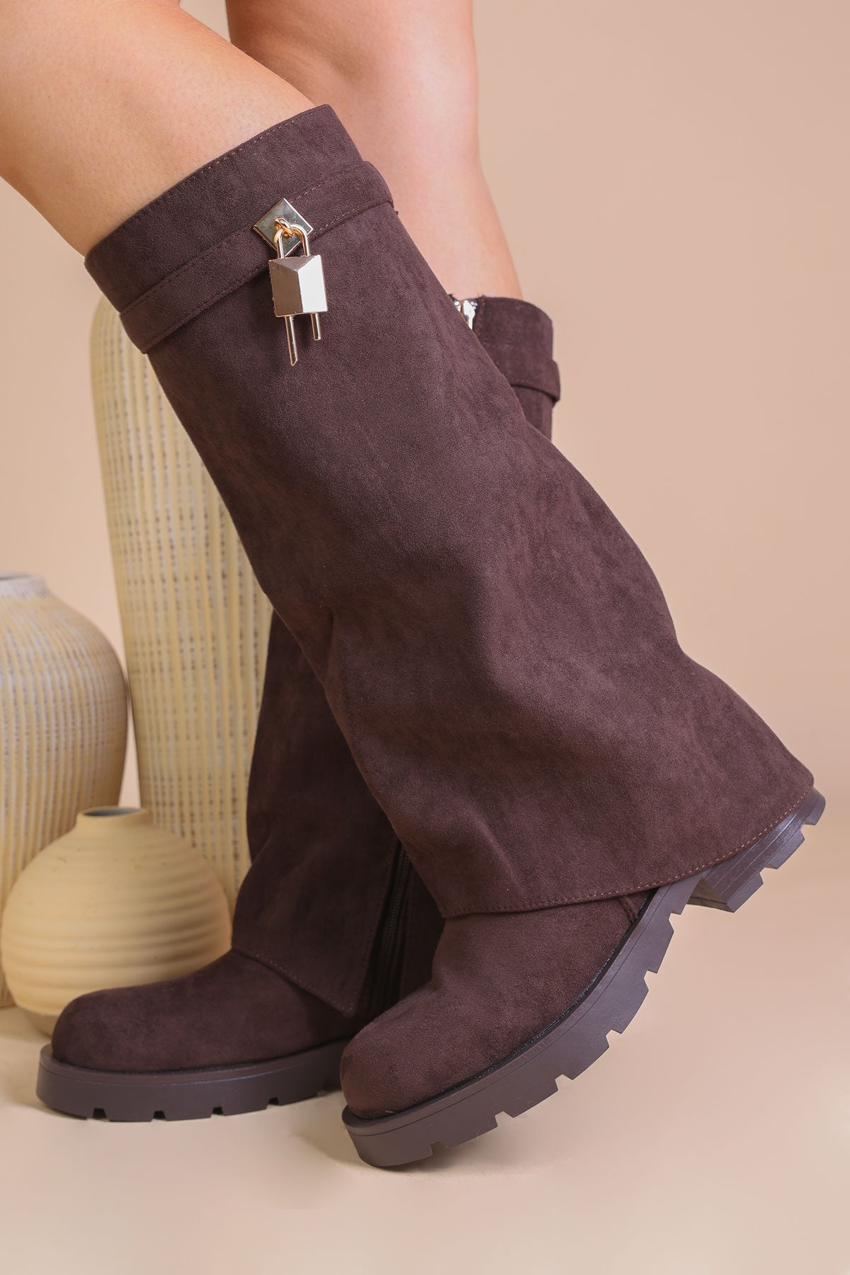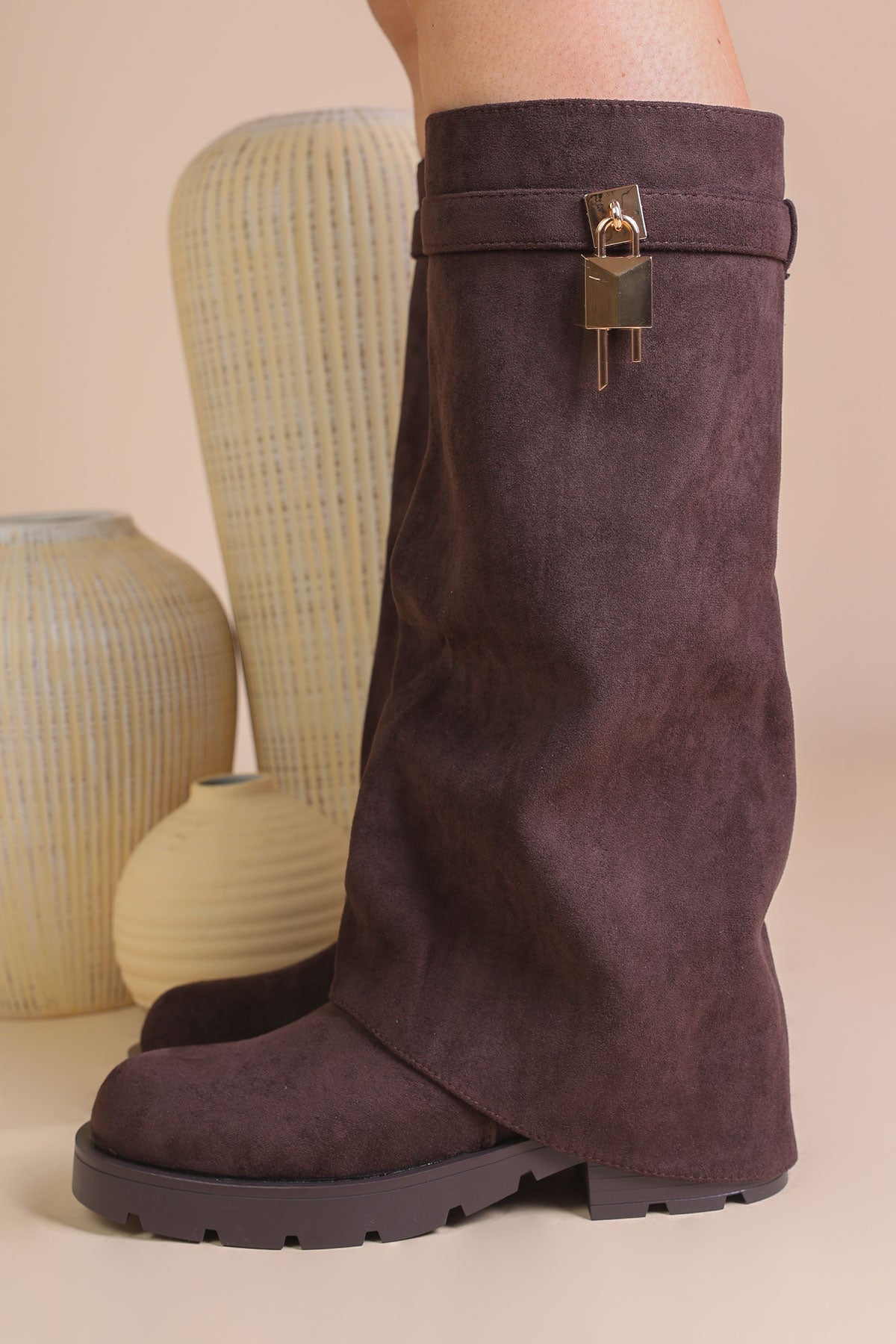 Step out in style with these chic brown faux suede knee-high boots. Featuring a sleek, unique gold-tone lock buckle detail on the side, these boots are designed to make a statement. The rich, Brown faux suede offers a timeless look, while the sturdy sole provides both comfort and sophistication. Perfect for pairing with a dress or skirt, these boots will be a versatile and fashionable addition to your wardrobe. The boots come in their original box, ensuring they arrive in pristine condition.