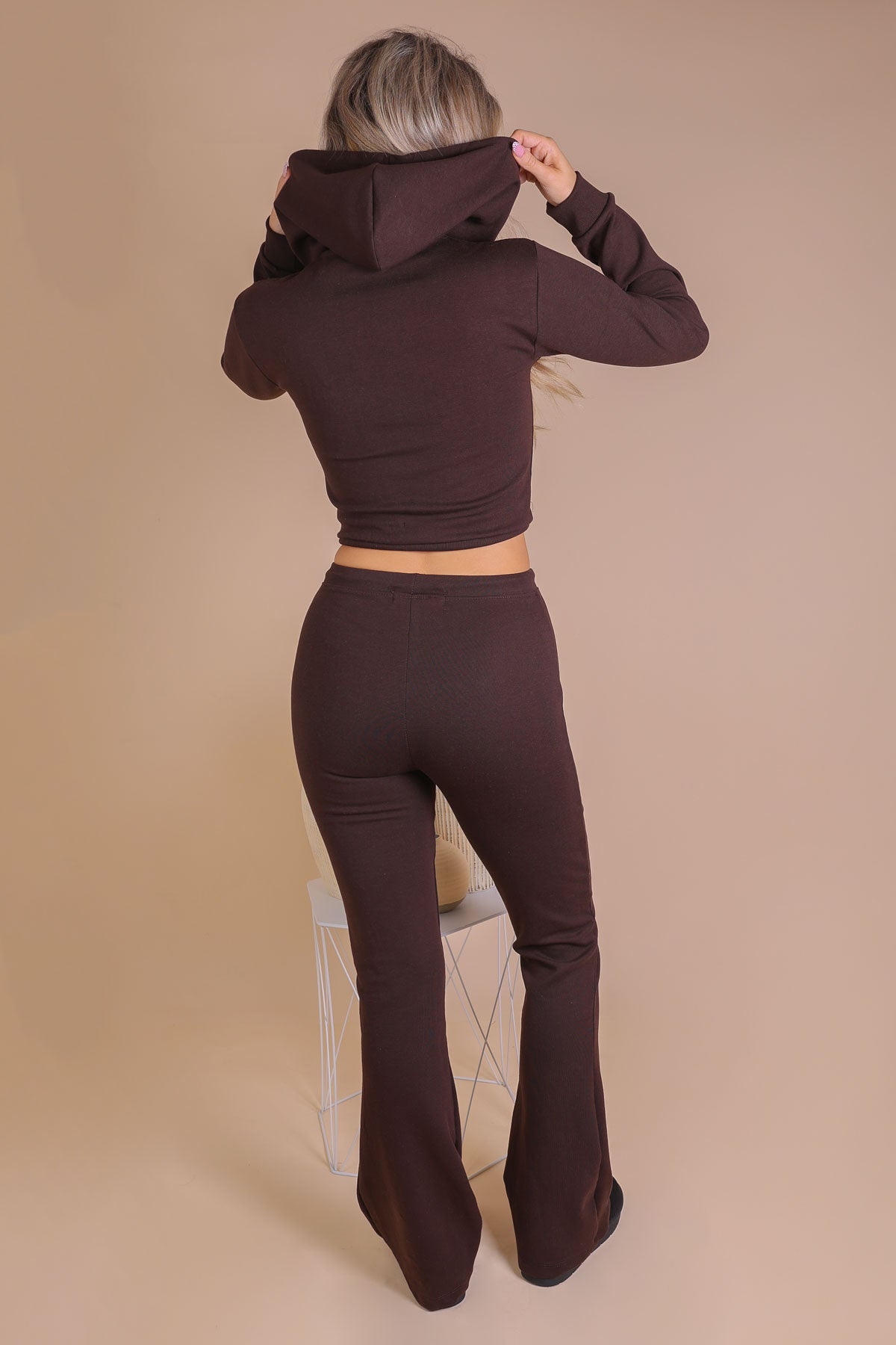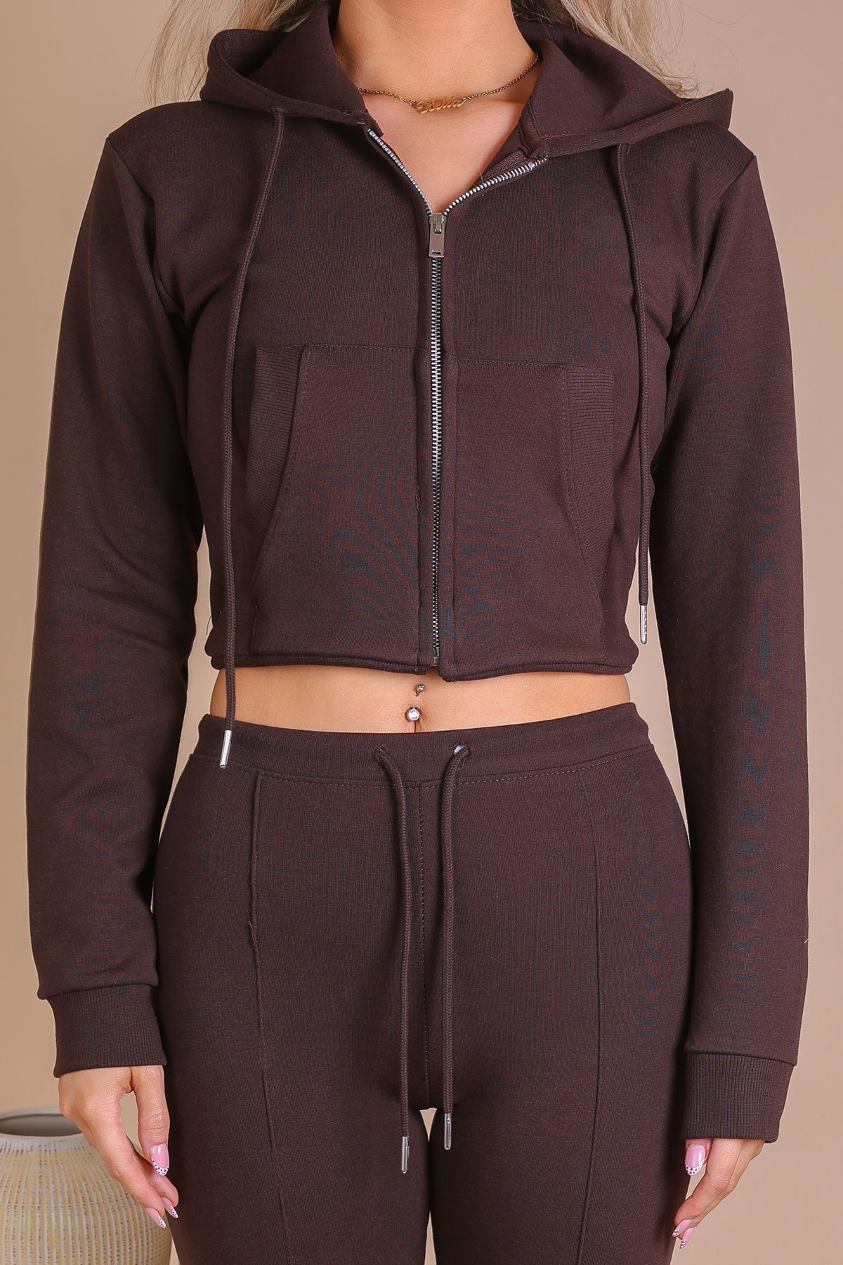 The Top: Features a modern cropped, zip-up hoodie with an adjustable drawstring hood, long sleeves, and ribbed cuffs. The fit offers a flattering silhouette.