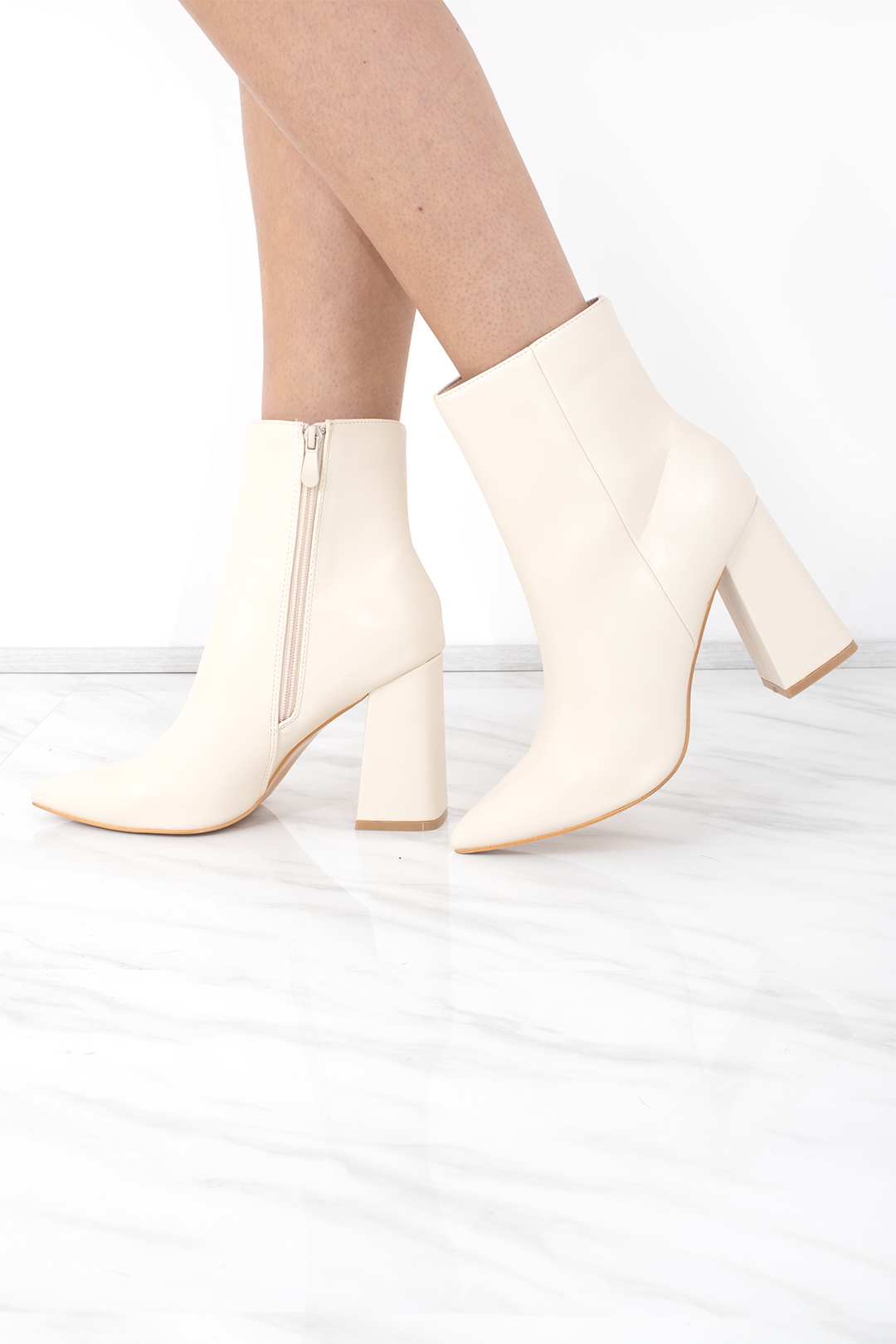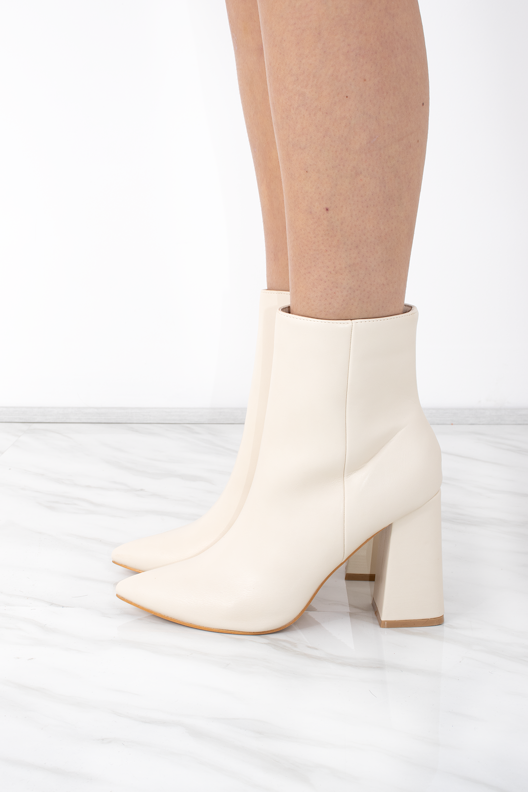 Cream Pointed Toe Faux Leather Block Heel Ankle Boot